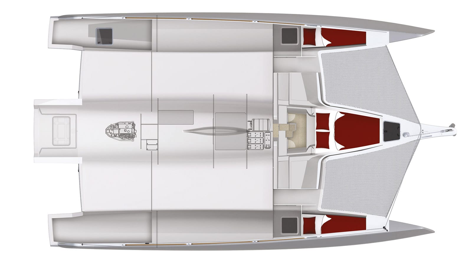 Après étude du trimaran Neel 43, nous nous rendons compte qu’il n’y a même pas 3 vraies cabines et qu’il faudrait utiliser les couchettes des flotteurs pour les deux grands, uniquement accessibles par l’extérieur. Cela ne nous convient pas du tout et nous ne donnons pas suite sur ce bateau.