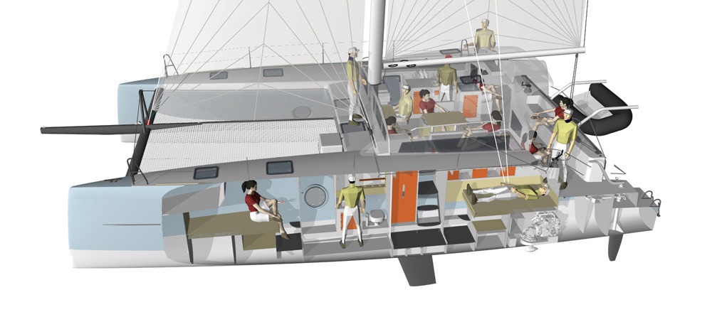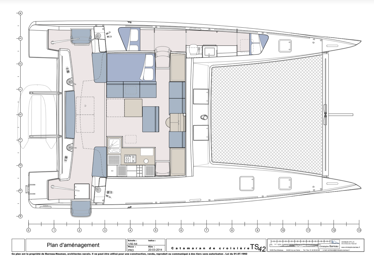 Nous avons étudié différentes options très différentes en terme de calendrier et de budget. Dans les options que nous n’avons pas encore évoquées, il y a eu également les TS / ORC du chantier breton Marsaudon Composites. Ils sont encore plus performants, trop même ! Le plan du TS42 où il faut traverser le cabinet de toilettes pour rentrer dans la cabine avant nous en convainc rapidement. Le but de notre voyage n’est absolument pas une régate autour de l’Atlantique, c’est un voyage d’abord.