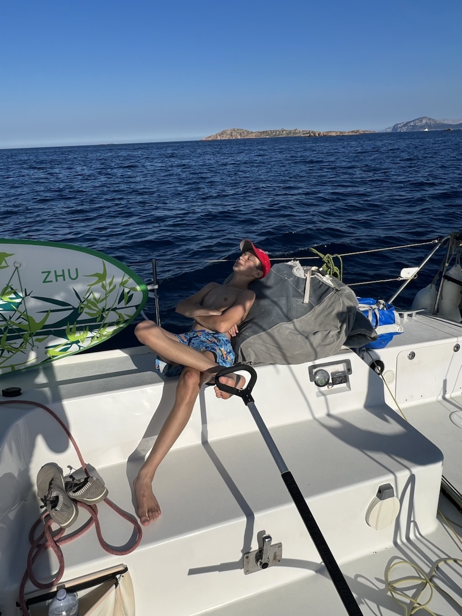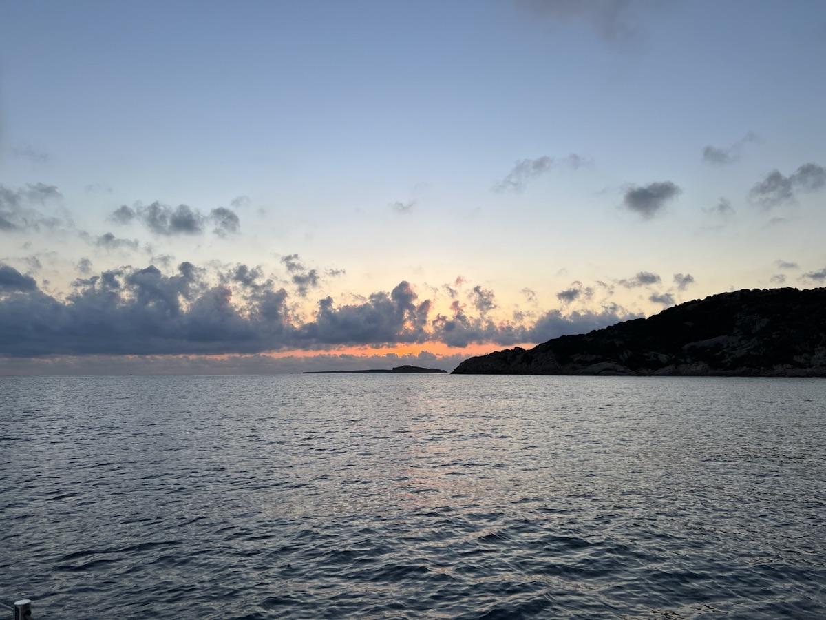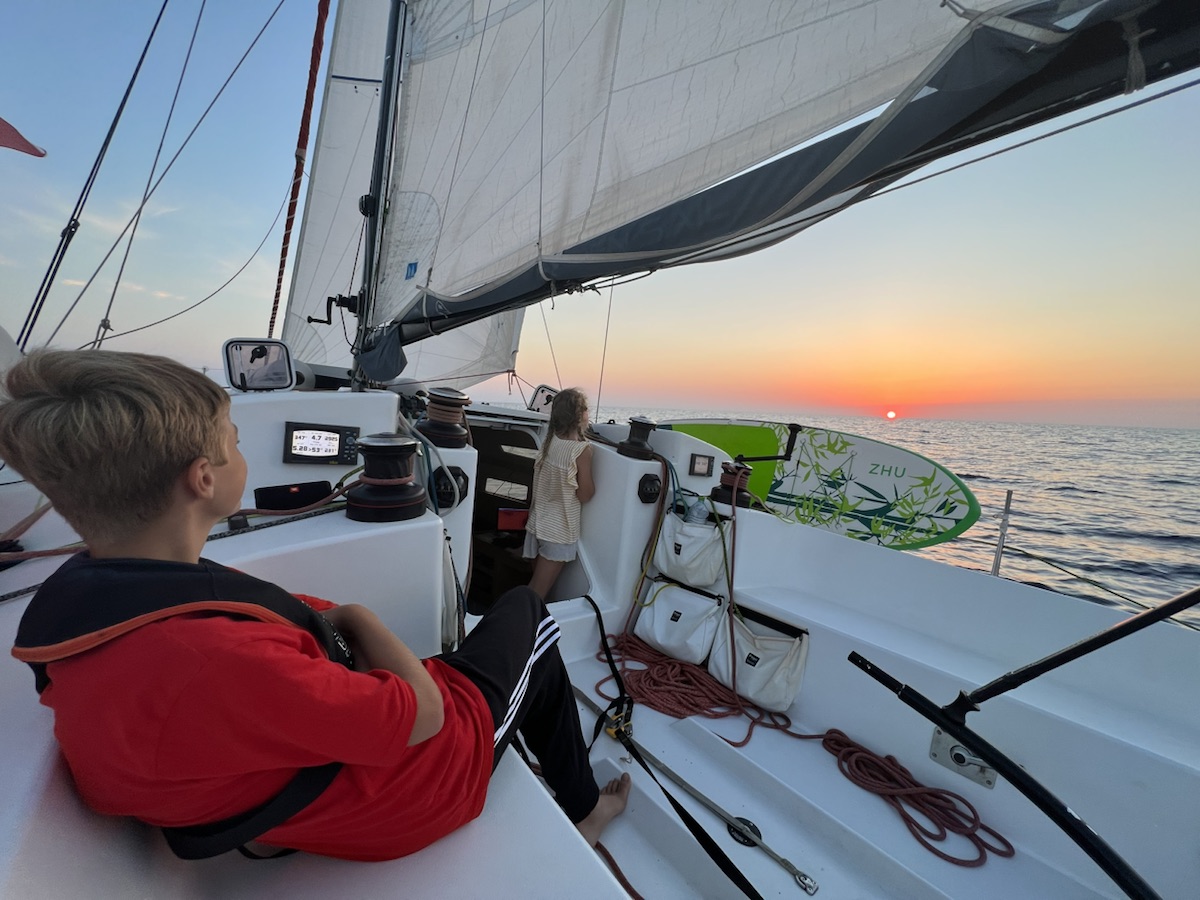 Pour la première fois, nous organisons trois quarts car Arthur souhaite prendre un quart par lui-même et le capitaine est prêt à essayer. Les conditions, très légères, sont idéales pour cette première expérience. Martin puis Alice viendront profiter de la chaleur nocturne sur le pont pendant le quart d’Arthur puis de Magali, écoutant de la musique en regardant les étoiles s’allumer. La nuit se passe très bien, même si la bascule se fait un peu attendre. Arthur aura la chance de voir le lever de soleil sur les montagnes Corses au loin (+ de 100km !).