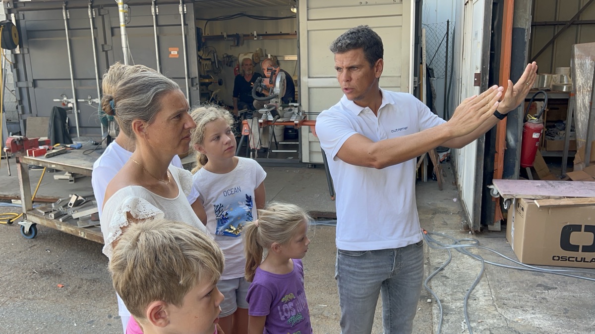 Romain nous accueille dans les bureaux et, après les présentations, nous partons visiter le chantier. Nous commençons par traverser la cour où un pont d’Outremer 45 est en train d’être démoulé à l’aide d’une grue immense. Puis nous traversons les ateliers pour nous rendre dans celui où la coque est moulée en trois parties. Romain nous explique que les deux demi-coques « extérieures » sont moulées à plat à part de la nacelle avant d’être assemblées telles des gigantesques morceaux de puzzle en 3D. Toute la famille suit les explications avec attention !