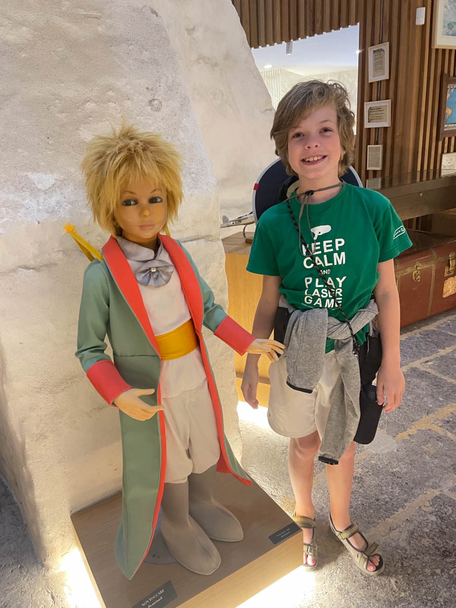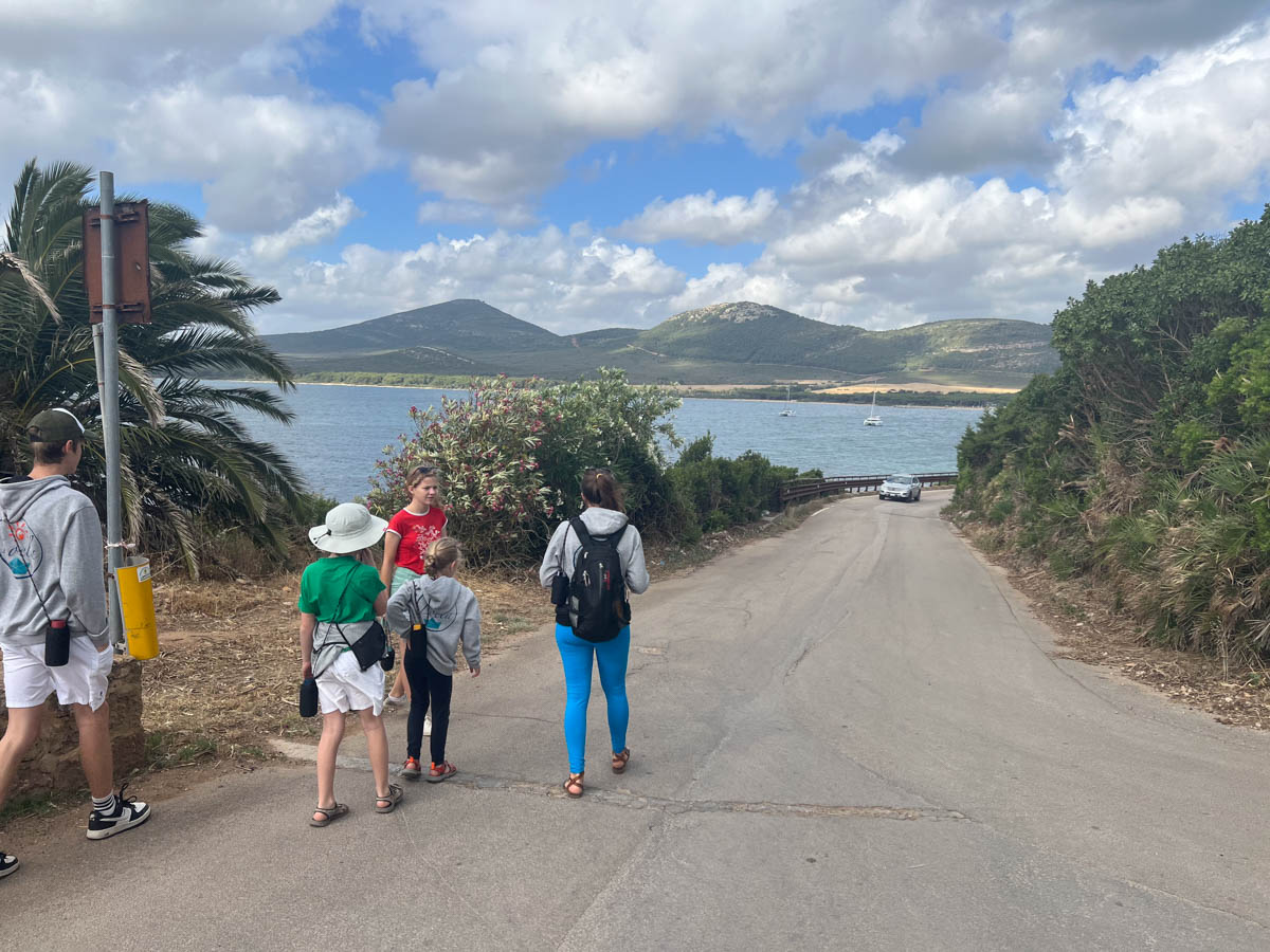 Grace aux indications d’un bateau sur l’application Navily (qui permet de repérer les mouillages et de partager ses expériences), Magali prépare des visites culturelles. Après le goûter nous partons en annexe vers une marina toute proche pour débarquer. C’est dimanche il n’y a personne pour nous renseigner, alors on se gare sur un ponton et on sort par un petit portail. Nous longeons la route à pied (il n’y a pas de trottoir ici) jusqu’à une ancienne tour génoise qui abrite un petit musée sur l’aviateur-écrivain Antoine de Saint-Exupéry. Nous découvrons la dernière partie de la vie de Saint-Ex qui faisait des missions de repérage aériennes à partir de la base aérienne d’Alghero. Ça donne envie à tout de le monde de lire ou relire le Petit Prince. Avant de retourner au bateau nous allons repérer l’arrêt de bus pour le lendemain matin. Heureusement qu’un habitant nous l’indique car il n’est pas situé sur la grande route côtière mais dans une rue perpendiculaire ! Nous nous dirigeons vers la marina pour récupérer l’annexe mais tous les portails sont fermés :(( Nous trouvons un passage en escaladant un muret et en traversant un café désaffecté qui jouxtait la marina ; il faudra trouver une autre solution pour lundi…