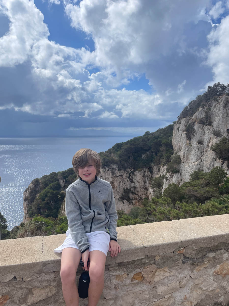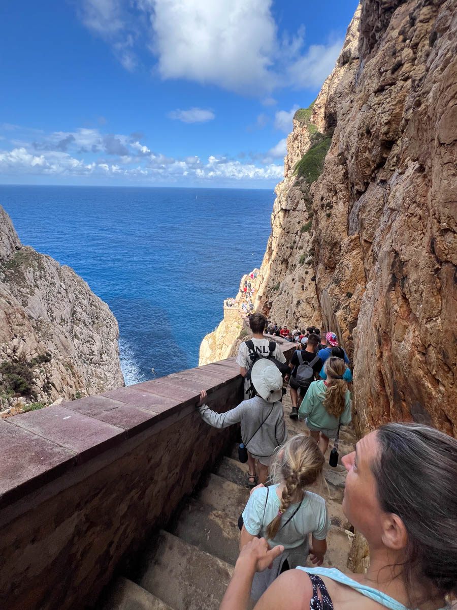 Lundi matin réveil à 8h (c’est l’aurore pour nos ados) pour prendre le bus à 9h41 en direction de la grotte de Neptune où Magali a réservé une visite en début d’après-midi. Il faut préparer un pique-nique et les vêtements de pluie car des orages sont annoncés. Nous fonçons vers la marina car la préparation a été un peu plus longue que prévue. Là, Antoine cherche un moyen de laisser l’annexe en sécurité pour la journée et de pouvoir rentrer dans l’enceinte sans faire le mur. Le gardien nous demande 5€ pour la journée et nous montre le bouton du portail : soulagement ! À présent il faut courir pour attraper le bus, nous y arrivons juste à l’heure. C’était sans compter sur les retards des chauffeurs italiens. Finalement nous arrivons sans problème au Capo Caccia pour 10h10, c’est tout au bout de la baie sur un éperon rocheux très impressionnant. Le chauffeur fonce sur la route à flanc de coteau, il faut avoir confiance ! En demandant au guichet on va pouvoir visiter la grotte plus tôt que prévu et ainsi reprendre le bus à 12h au lieu de 16h. La visite commence par la descente de la falaise par un chemin escarpé de 654 marches car la grotte se trouve au niveau de la mer. Nous entamons la descente en admirant la vue. Martin compte les marches pour vérifier les dires des guides. Il y a bien 654 marches pour arriver à l’entrée de la grotte mais ça continue à descendre à l’intérieur … Martin comptera 814 marches en tout !