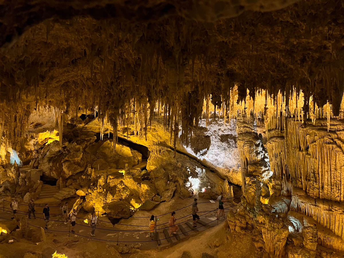 L’intérieur est somptueux, c’est une succession de salles aux piliers de stalactites et de stalagmites. Nous suivons un petit chemin creusé dans la roche et écoutons les explications en italien et anglais. Le calcaire grandit de 1 cm3 par an ! Étant donné la taille des piliers devant nous, on est dans une antiquité. Les chercheurs estiment que les concrétions ont commencé à se former il y a plus de 100 millions d’années. Nous nous émerveillons devant les plafonds de stalactites qui ont des formes particulières en étoiles aux branches horizontales que même les scientifiques n’expliquent pas. Normalement, les gouttes descendent à la verticale mais, ici, il y en a qui partent à l’horizontale !