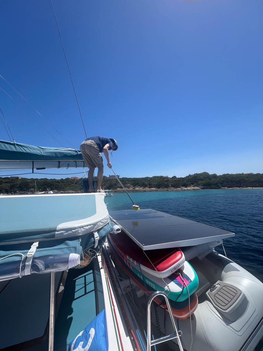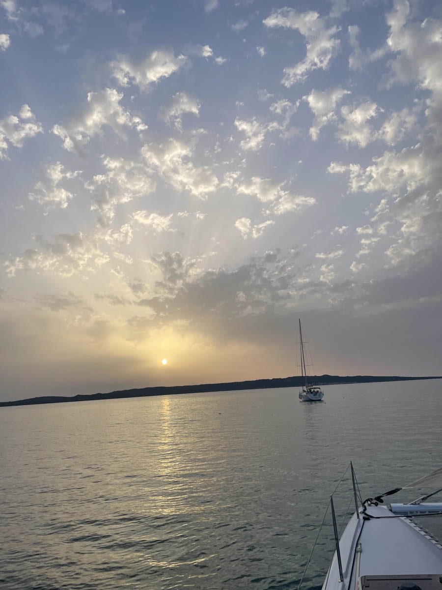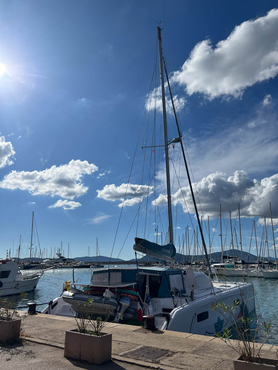 La traversée entre la Corse et la Sardaigne a été houleuse et dimanche 23 juin c’est grasse matinée pour tout le monde après cette soirée très agitée. Le vent va continuer à souffler trop fort, nous prévoyons de rester quelques jours dans le coin.