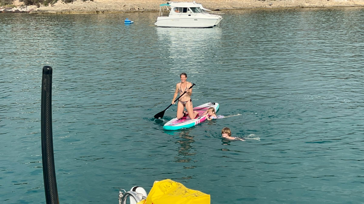 Le lendemain vendredi 28 juin il fait très chaud dès le réveil. Les parents vont faire des courses en ville et au retour le thermomètre affiche 41 degrés dans le bateau et pas de vent pour rafraîchir. Nous décidons de partir sur le champ pour faire plouf à la plage de Calasetta sur l’île de Sant’Antioco. Nous partons au moteur sur cette île juste en face du port, et en 1h on y est. Antoine et Magali vont à la nage jusqu’à la plage puis marchent le long de l’eau et vont découvrir la saline qui se trouve juste derrière. À la tombée du jour les enfants vont tous les 4 jouer sur la plage en paddle, ils profitent de l’eau plus chaude près de la plage qui descend en pente très douce. Samedi 29 juin nous profitons tous de la plage de Calasetta qui est bien plus fréquentée le week-end.