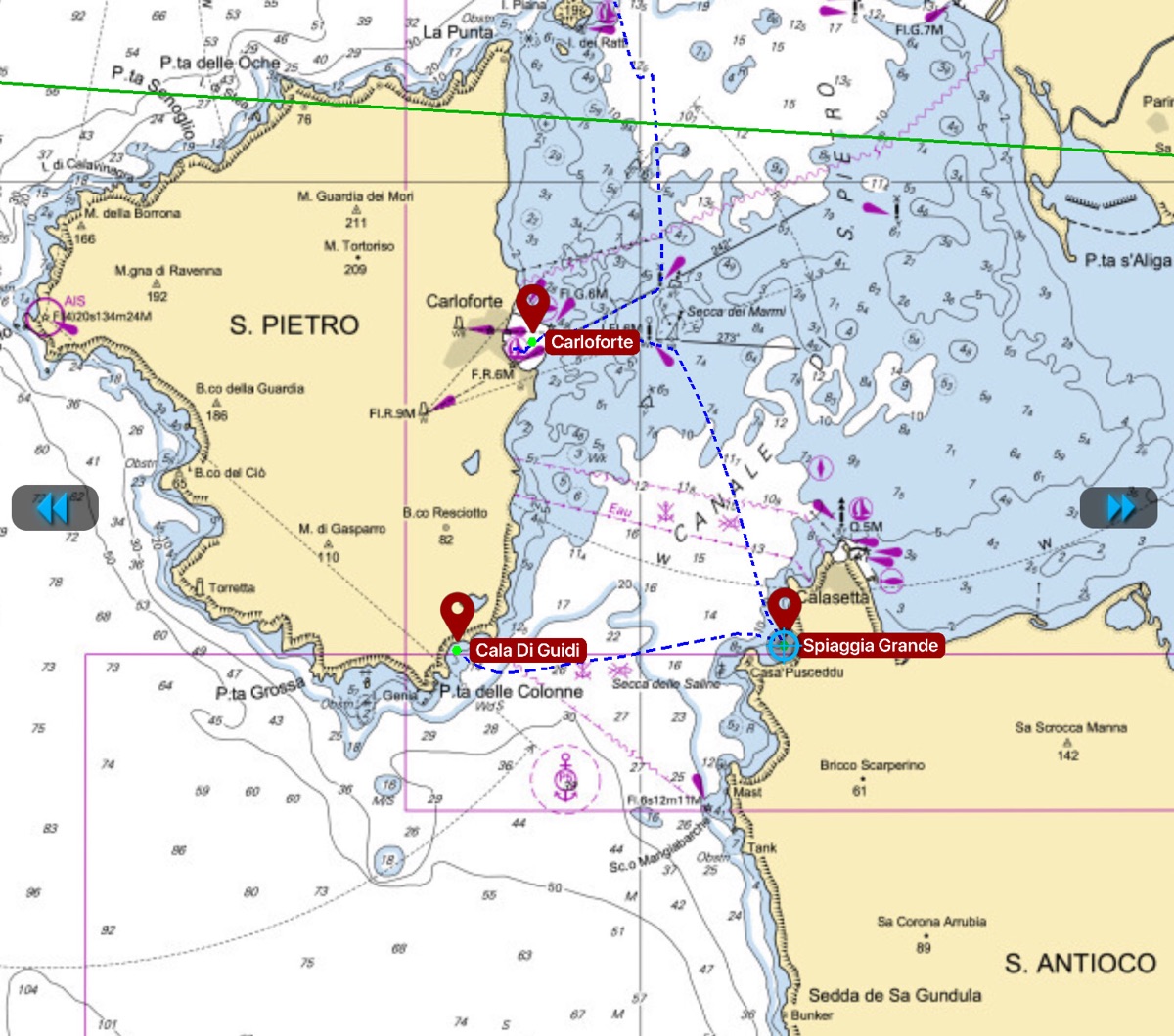Mercredi 26 juin, il est midi quand nous quittons le port d’Alghero pour profiter d’un petit vent et peu de vagues qui nous poussent vers le sud. Nous visons une arrivée dans la nuit à la marina de Carloforte sur l’île de San Pietro, espérant avoir du vent jusqu’au bout du trajet. Nos amis de Stardust nous avait vanté la beauté de cette île et l’accueil chaleureux d’Andrea à la marina. Effectivement Antoine discute sur Whatsapp avec Andrea en français pour nous réserver une place de nuit avec toutes les explications nécessaires pour être serein. La navigation est très agréable pour tout le monde : est-ce dû au médicament ou aux conditions plus calmes ? Vers 20h30 le vent est allé se coucher, alors on met le moteur et les enfants font une partie de Mario Kart pendant que les parents sont allés dormir avant de finir la navigation. C’est le « Mario quart de nuit ». Après chaque course, le vainqueur sort faire un tour d’horizon pour surveiller un éventuel bateau et vérifie l’écran de l’AIS. On arrive à 2h du matin en suivant les feux des phares et balises.