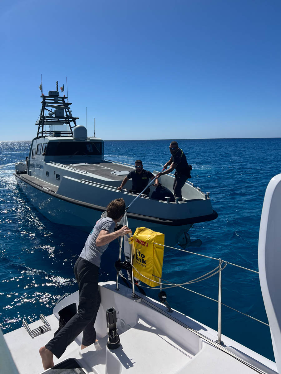Le vent a continué à souffler jusqu’à 35 noeuds toute la nuit et toute la journée. On surveille l’ancre toute la nuit grâce à la fonction qui permet d’afficher l’écran des instruments sur l’iPad posé dans notre cabine, et tout tient parfaitement bien. À 10h on se fait réveiller par la Guardia Finanzia pour un contrôle des papiers : ils déploient une grande épuisette pour récupérer nos papiers ! Tout est en règle mais ils ont même demandé nos permis bateau pourtant pas obligatoire en bateau à voile battant pavillon français.
