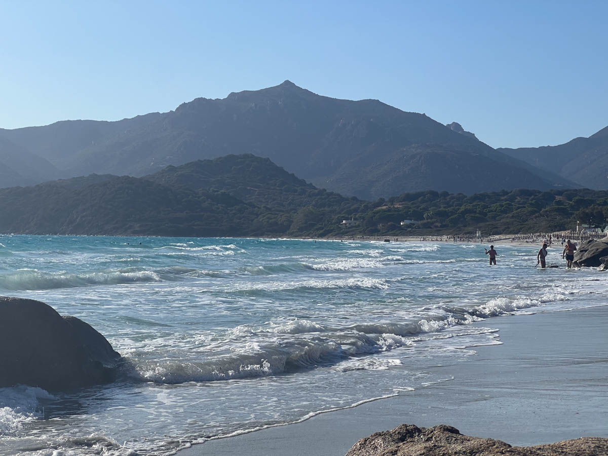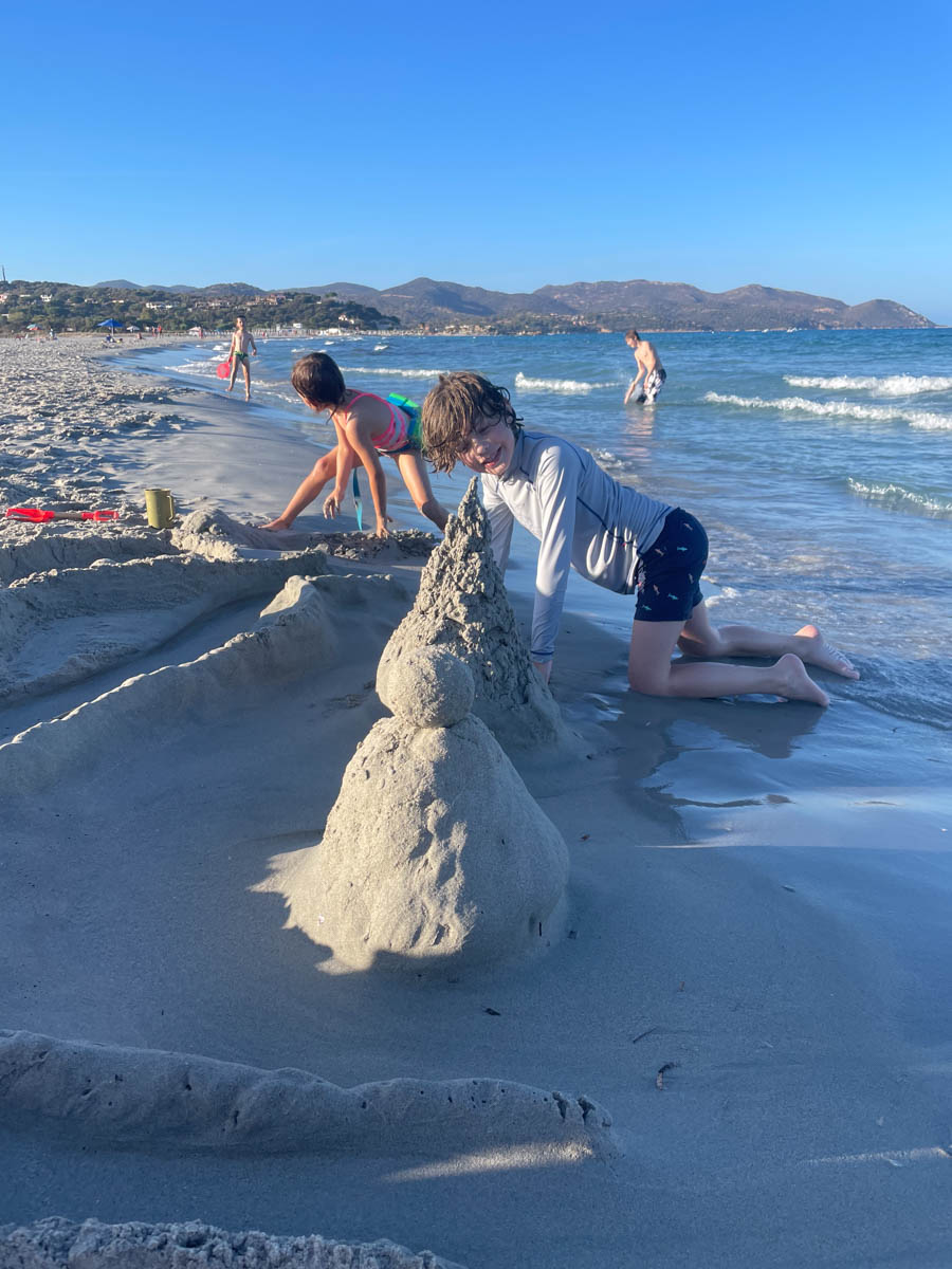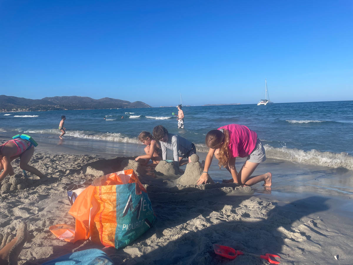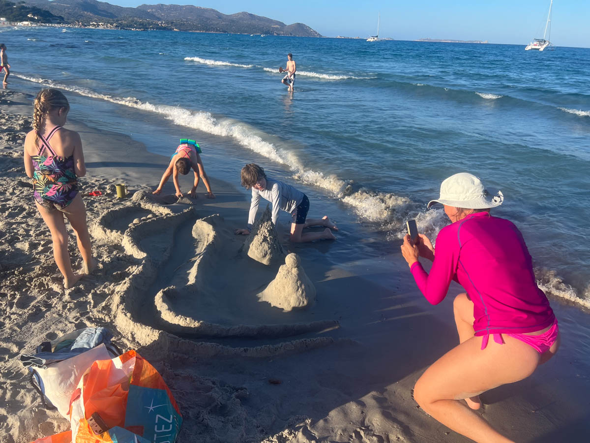 Vendredi 5 juillet le vent se calme et le soleil revient. Nous faisons un grand nettoyage du pont et du cockpit. Les grosses vagues de la dernière navigation n’ont pas enlevé tout le sable rouge du Sahara. Mathilde et Martin font une heure d’école pendant que Arthur farniente sous la canopée à l’ombre. Pour le goûter nous voulons goûter une glace italienne dans une gelateria du village qui se situe à 3 kilomètres à pied. On repère un chemin plus court en accostant sur la plage directement à côté du village. Mais c’était sans compter les sauveteurs qui surveillent les nombreuses plages privées et qui refusent catégoriquement de nous laisser descendre de l’annexe. Dépités on se rabat sur notre plage de la veille et son bar qui vend des Magnums mais on l’aura eue, notre glace ! Comme prévu le vent a tourné de 180 degrés en fin d’après-midi et les vagues se brisent sur la plage et nous mouillent de la tête au pied en remontant dans l’annexe. On va devoir tout rincer et sécher ! On apprend de nos erreurs et la prochaine fois on mettra les serviettes de plage dans un sac étanche.