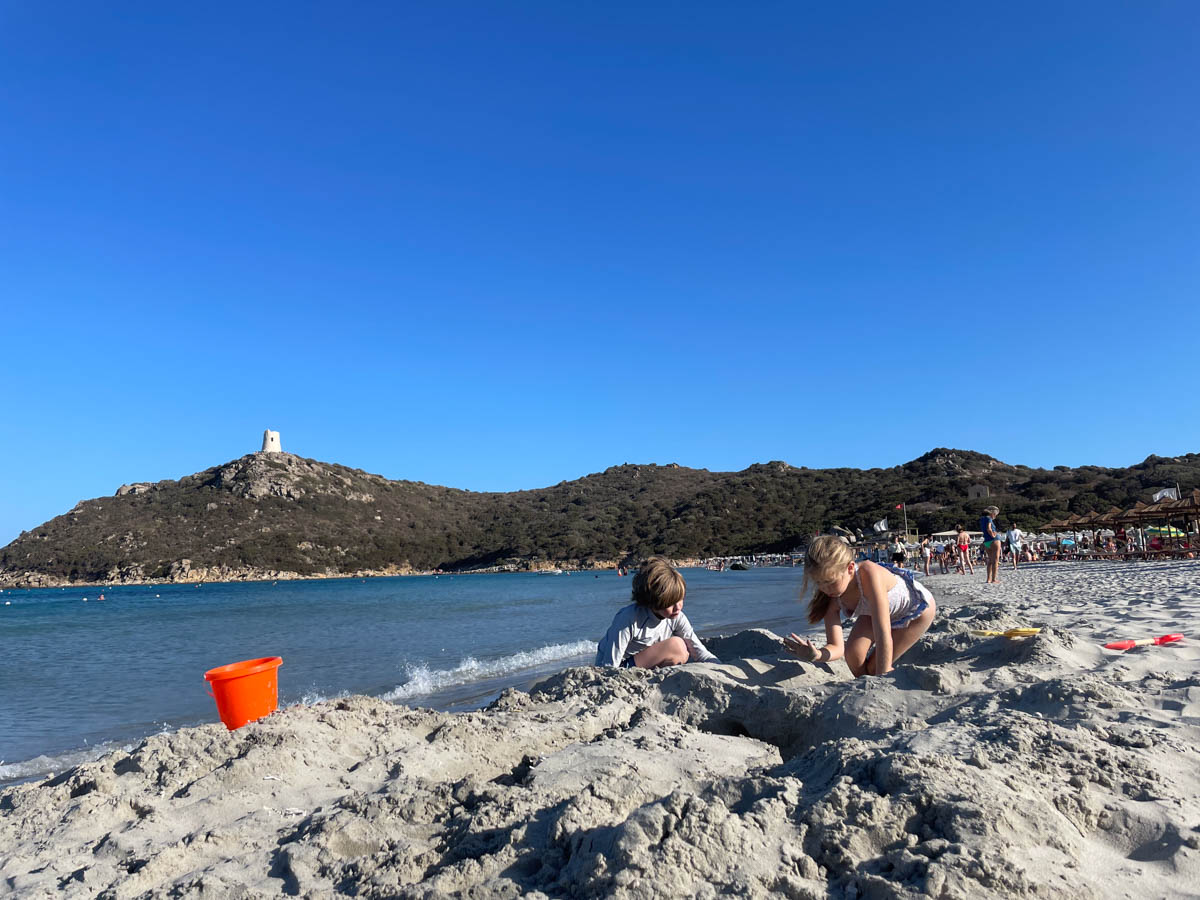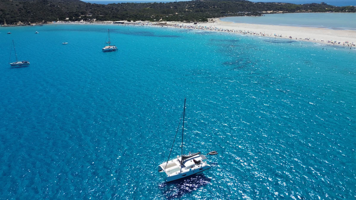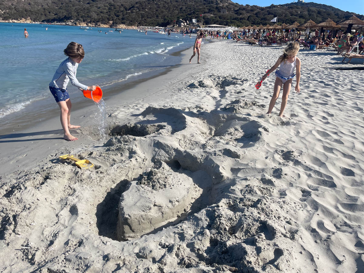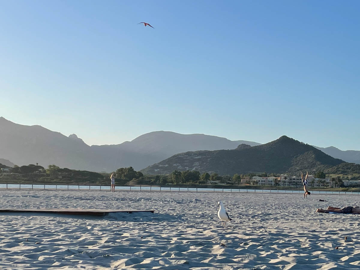 On se repose le matin, on joue, on écrit le blog et l’après-midi départ vers la plage de Porto Giunco en annexe. Il faut dire que nous sommes devant une des plus belles plages de Sardaigne surnommée Tahiti Spiaggia car le sable est blanc et l’eau turquoise. C’est l’occasion de ressortir le drone pour faire des vues dignes des plages des caraïbes ! (Jusqu’ici, vu le vent rencontré, nous avons été prudent, d’autant qu’à bord d’un bateau, la zone de départ est mouvante et il ne peut donc pas retourner « tout seul » au départ, il faut l’attraper en vol)