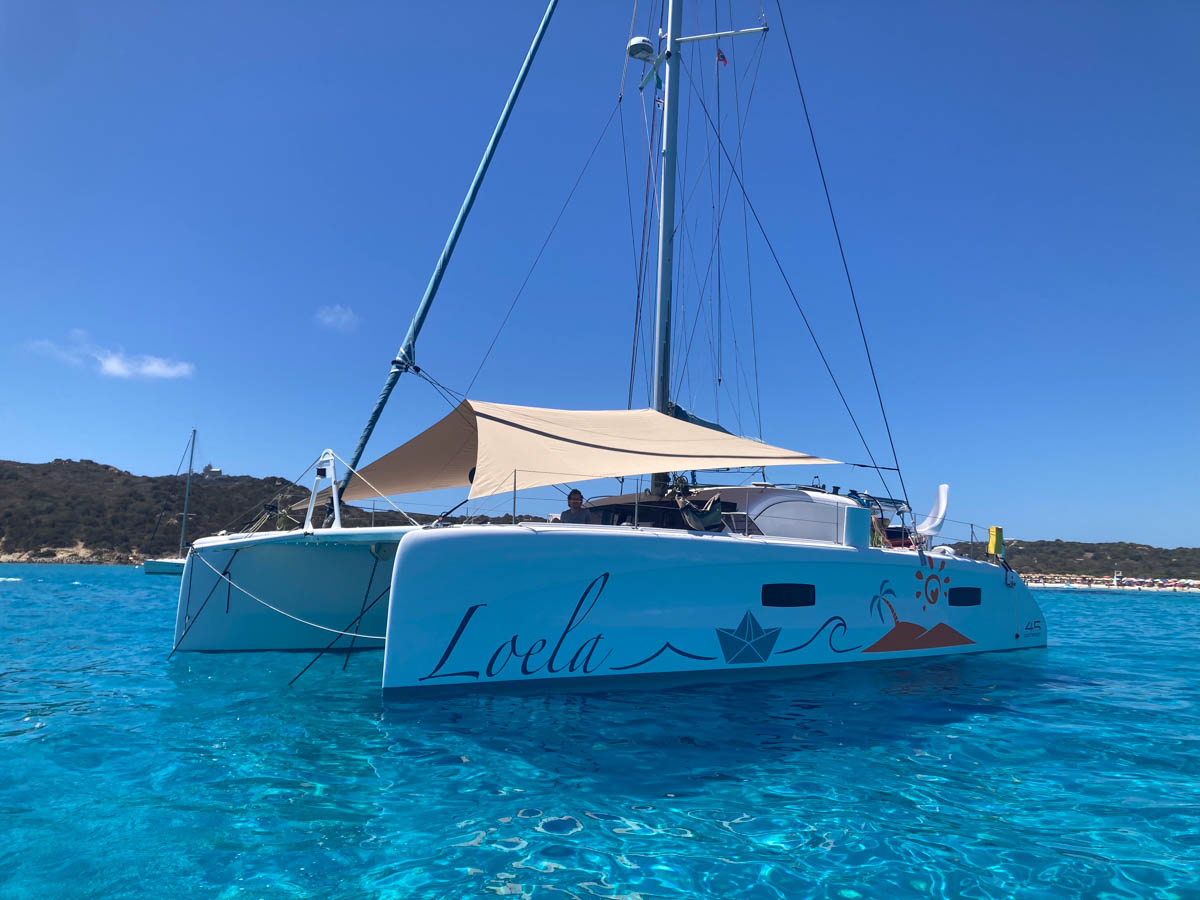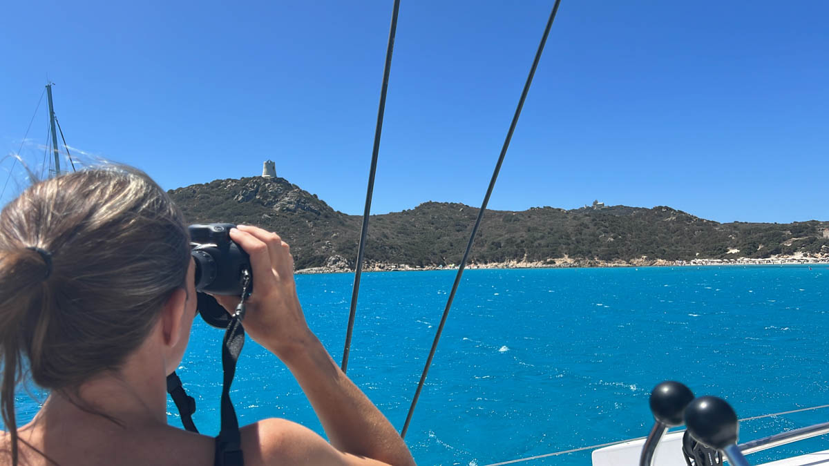 Dimanche 7 juillet, il est 8h et le vent a bien tourné pendant la nuit. On se retrouve à nouveau trop près de la plage, à l’intérieur de la ligne de bouées, ce que nous signale les gardes-côtes vers 9h45. Ce n’est pas grave car on a prévu de partir. On va faire la navigation avec Ilo. À 10h on hisse les voiles (Grand-voile et Solent puis on prend un ris car le vent est plus fort que nous l’imaginions), on passe à nouveau entre les îles du Capo Carbonara et la terre puis on continue vers le nord avec un bon vent jusqu’à 28nds. On enregistre à nouveau une pointe de vitesse du bateau à 15 nds ! Avec les vagues moins haute et surtout le débriefing que nous avons fait tous les quatre avec Ilo, c’est beaucoup moins impressionnant que mercredi. À 13h on arrive devant la plage au nord du Capo Ferrato, c’est plus sauvage on n’aura pas de problème pour poser l’annexe sur le sable. Par contre, la petite houle de Sud-Est contourne le Cap et nous fait légèrement rouler puisque le vent de Sud nous maintient en travers. Heureusement, l’équipage commence à s’amariner et n’est pas gêné.