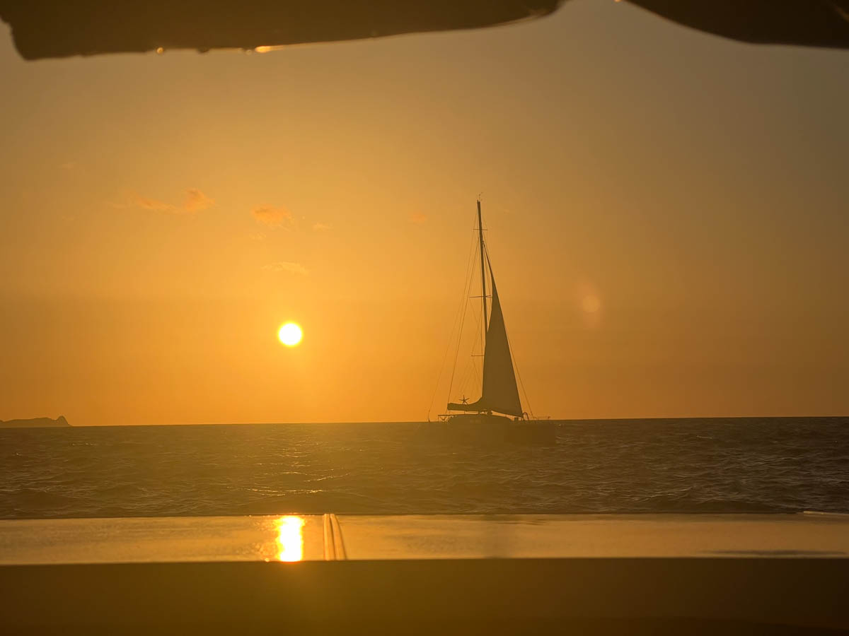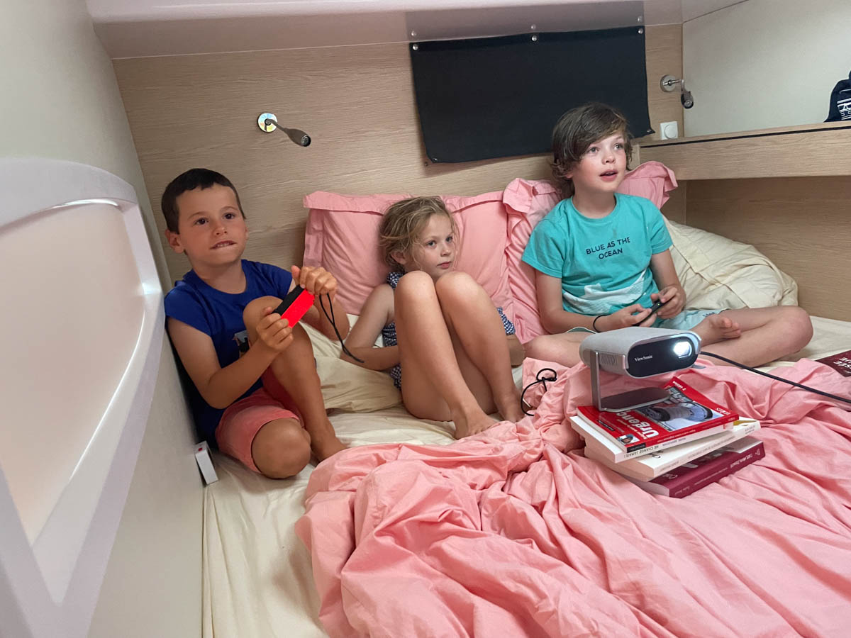 Maintenant que tout le monde est à bord d’Ilo, nous pouvons dignement fêter l’anniversaire de Titouan et partager mousse au chocolat et charlotte aux pêches. Miam ! Il est temps à présent de continuer les festivités à la plage. Chaque bateau prend son annexe et accoste sur le sable. Ilo se prend une vague en arrivant et leurs serviettes sont mouillées, nous aussi l’arrivée est un petit peu mouillée mais on avait prévu le sac étanche pour les serviettes et l’eau est à 26 degrés : ce n’est pas grave si on saute dedans. On peut alors jouer sur cette grande étendue de sable clair : construction en sable, ramassage de coquillages, ballon, raquettes et body-surf (sans planche) dans les rouleaux. À 19h on voit une rafale de vent du nord qui soulève le sable. Tout le monde remonte précipitamment dans son annexe pour aller s’assurer que nos bateaux vont bien tourner sur leur ancre sans s’entrechoquer. Avec le vent fort, les vagues du nord se forment à plus d’un mètre, ça bouge à bord car cela vient s’ajouter à la petite houle du Sud-Est. Pendant la préparation du dîner, Titouan vient à bord pour jouer à Mario Kart avec Martin et Mathilde qui lui avaient offert ce temps de découverte des jeux vidéo comme cadeau d’anniversaire : il a l’air d’apprécier !
