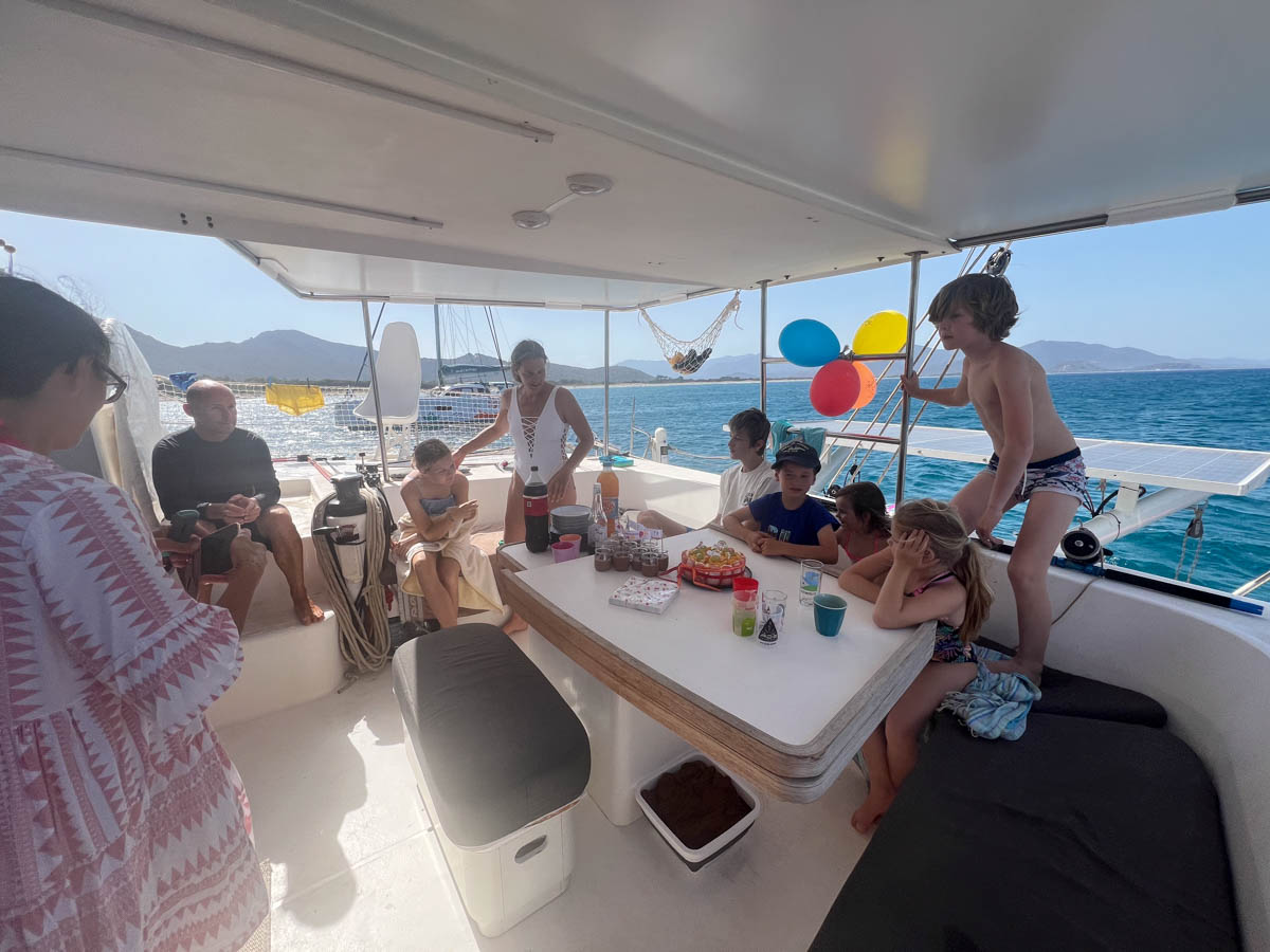 Après déjeuner on se prépare pour aller au goûter d’anniversaire des 7 ans de Titouan sur Ilo. On sort les 3 paddles car les 2 bateaux sont à 20m l’un de l’autre. Mais avec le vent qui souffle à plus de 20 nds, c’est difficile. Arthur et Mathilde y arrivent sans trop de problème en s’avançant le long de Loela à la main, puis en faisant un joli « bac » avec de bons coups de rames. Ensuite c’est au tour d’Alice et Magali qui essaie de reproduire la technique d’Arthur mais Alice tombe à l’eau et Magali a du mal à ramer ; elles finiront à moitié à la nage et à moitié à la rame. Quant à Antoine et Martin ils partent dos au vent et ont beaucoup de mal à remettre le paddle face au vent. Ensuite, ils ont bien dérivé sous le vent et n’arrivent pas à remonter face au vent, ils continuent à dériver. Heureusement Frédéric met rapidement l’annexe d’Ilo à l’eau et va sauver les naufragés. Que d’aventures, on se rappellera que les paddles ne sont pas sûrs avec du vent fort (note du relecteur : sauf en suivant les bons conseils, ceux d’Arthur…)