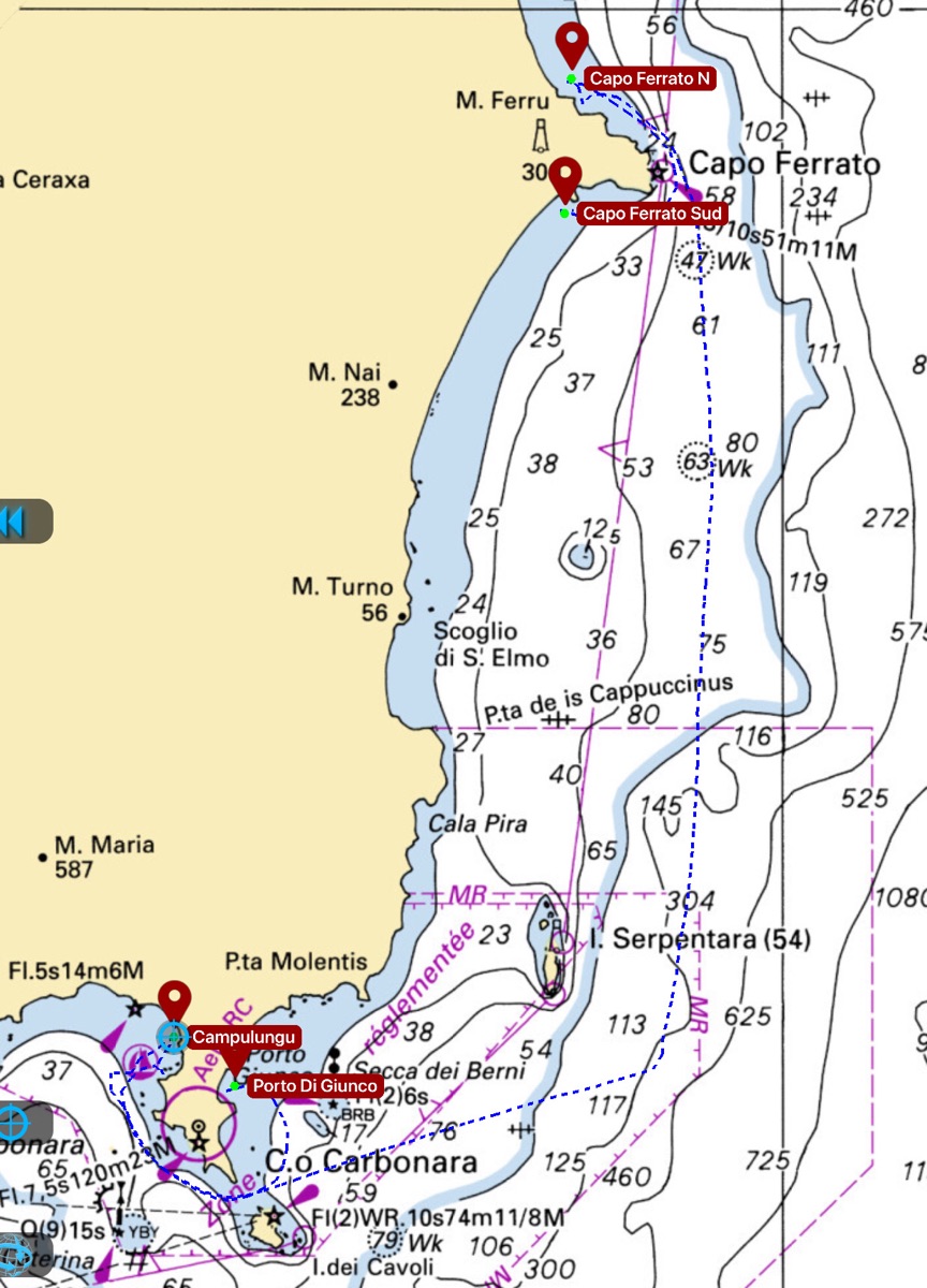De retour au bateau on se re-penche sur la météo qui nous annonce à nouveau une bascule pour dimanche, un vent du sud le matin qui va retourner nord en fin de journée, ce qui rend difficile la recherche d’un abri pour la nuit au calme. Et ensuite ce sera plus ou moins calme plat sur la zone. On se prend à rêver à rallier directement la Grèce en partant lundi matin pour 5 jours, les conditions « légères » sur le centre de la Méditerranée nous garantirait une traversée sans trop de vagues (maximum 1m quand même) mais pas forcément du vent tout le temps, il faudrait faire jusqu’à 2 jours au moteur sur les 5. Mais, avant, il faut changer à nouveau d’endroit pour éviter les vagues du sud. Avec Ilo qui rentre vers Toulon en remontant le long de l’est de la Sardaigne et de la Corse, nous projetons d’aller au nord de Capo Ferrato.