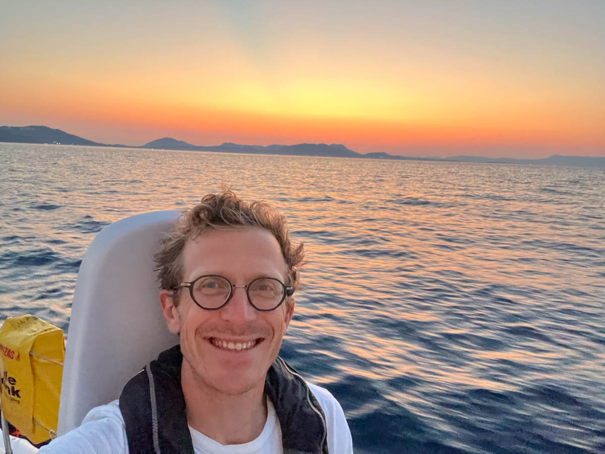 Dimanche 28 juillet, après avoir fait les courses à Petriti ,nous nous baignons une dernière fois. Nous gréons le gennaker car nous visons une fin de nuit au portant dans un vent du Nord après une première nuit plutôt au près dans un vent de Nord-Ouest. Nous levons l’ancre à 20h45 et partons au moteur le temps de contourner l’île par le sud. Nous dînons devant le dernier coucher du soleil sur une île grecque.