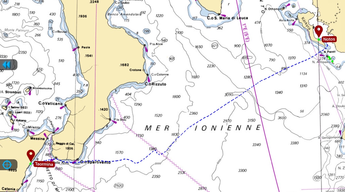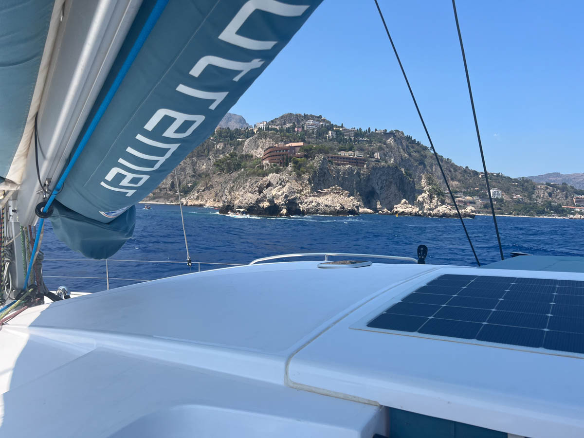 Cette traversée Corfou – Taormine de 278 miles aura duré 42h15, bien plus rapide qu’à l’allée mais bien sûr c’était moins loin et on a eu plus de vent. D’ailleurs les routages nous donnaient des temps plus longs, alors soit la météo s’est trompée, soit le bateau avance beaucoup plus vite que prévu … à chacun son interprétation.