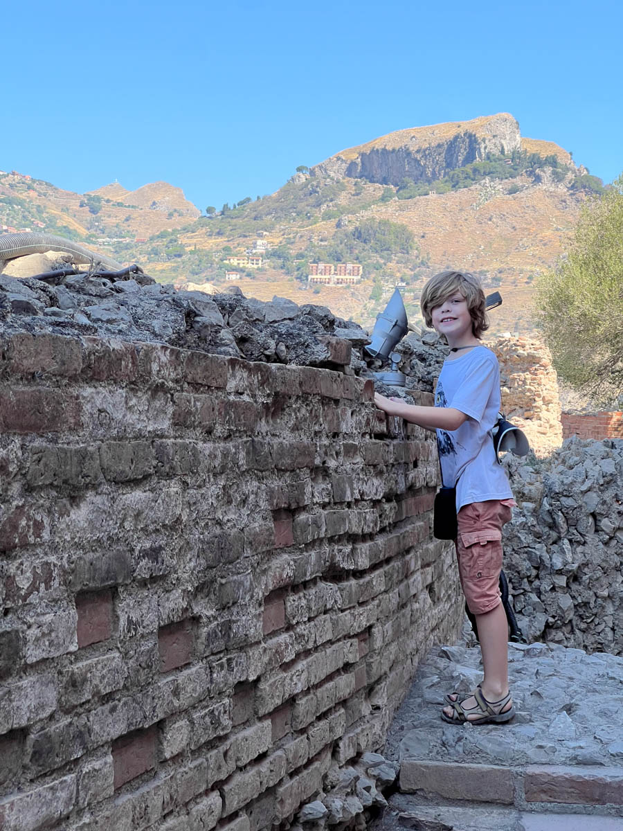 « Il y avait trop de soleil à Taormina surtout au théâtre antique. Le jardin botanique était trop beau. Le porte bonheur de la Sicile est la pomme de pin : il y en avait partout ! C’était rigolo d’en voir autant de toutes les couleurs.