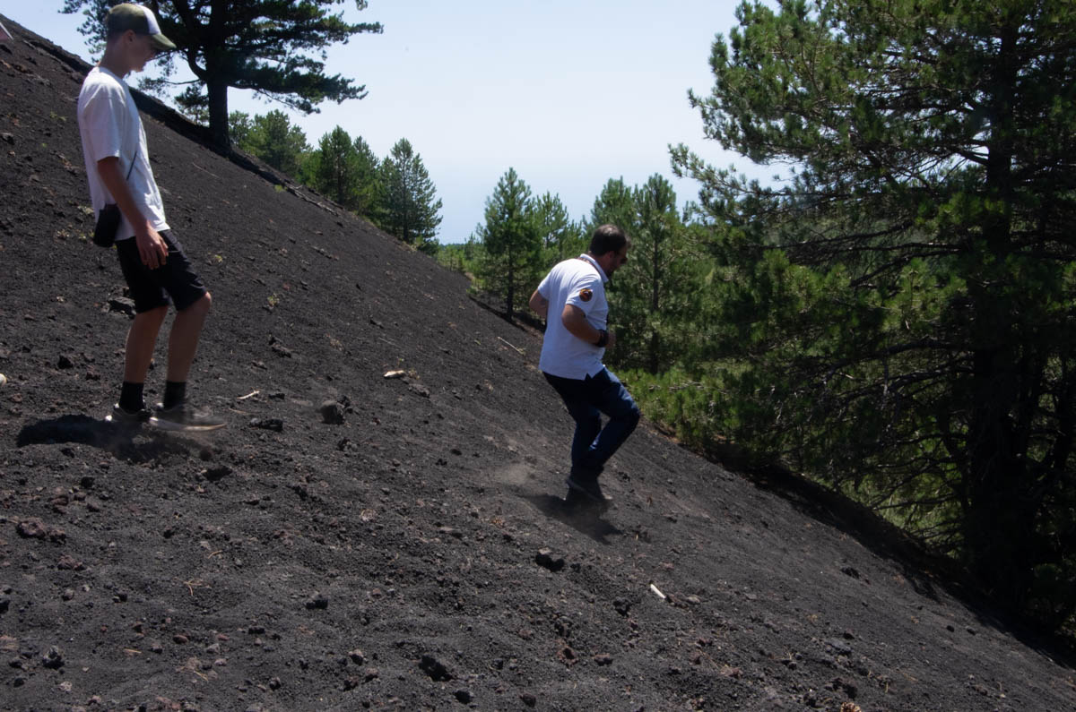Le lendemain à l’aube (8h) nous sommes partis visiter l’Etna en 4×4 (heureusement pour nos jambes) avec un guide qui parle français mais avec un bel accent italien. Il nous explique rapidement comment s’est formé l’Etna. Plus on monte et plus les habitations se font rare car il est interdit de construire au dessus de 1800m d’altitude. Mais point extrêmement positif après 2 mois de canicule il fait bon grâce à l’altitude. Le guide nous emmène grâce au 4×4 dans un hors piste que seul la compagnie de tourisme a le droit d’utiliser. Ce hors piste nous emmène à ce qui est pour moi le plus bel endroit de l’Etna : la vallée du bœuf. Cette vallée est magnifique car énormément de coulées de lave sont sorties par ici ce qui donne l’impression d’une mer noir et au milieu de ce flot tumultueux se dresse deux anciens bouchons de basaltes recouvert de végétation. Ensuite nous sommes montés sur un volcan secondaire, la vue depuis son sommet était spectaculaire. J’ai appris que la lave ne sort pas toujours par le ou les cratères principaux mais aussi par des cratères secondaires qui ne servent qu’une fois et après se bouche à cause de la formation d’un bouchon de basalte qui condamne le cratère secondaire. De plus ces cratères se forment très vite (100m en 4 mois) mais finissent par disparaître pour ne laisser que le bouchon de basalte comme dans la vallée du bœuf. La méthode que nous avons utilisé avec le guide pour redescendre est assez amusante, on se laisse glisser dans des conduits de sable volcanique sur les talons ce qui permet de descendre rapidement sans trop se fatiguer. Puis nous sommes allés manger, nous avons été servi en premier grâce à l’excellente gestion des timing de notre guide. Donc après un excellent repas nous nous dirigeons vers une grotte créée par une coulée de lave qui a servi il y a 3 siècles pour conserver la glace durant l’hiver. Glace qui servait autrefois à faire les granités, ces derniers étaient fait à base de miel, de citrons et de glace pilée. Après ça on est redescendu, durant le trajet Martin et Mathilde ont fait la sieste, on était tous fatigués à cause du changement de température et de pression ainsi que de la journée riche en émotions. »