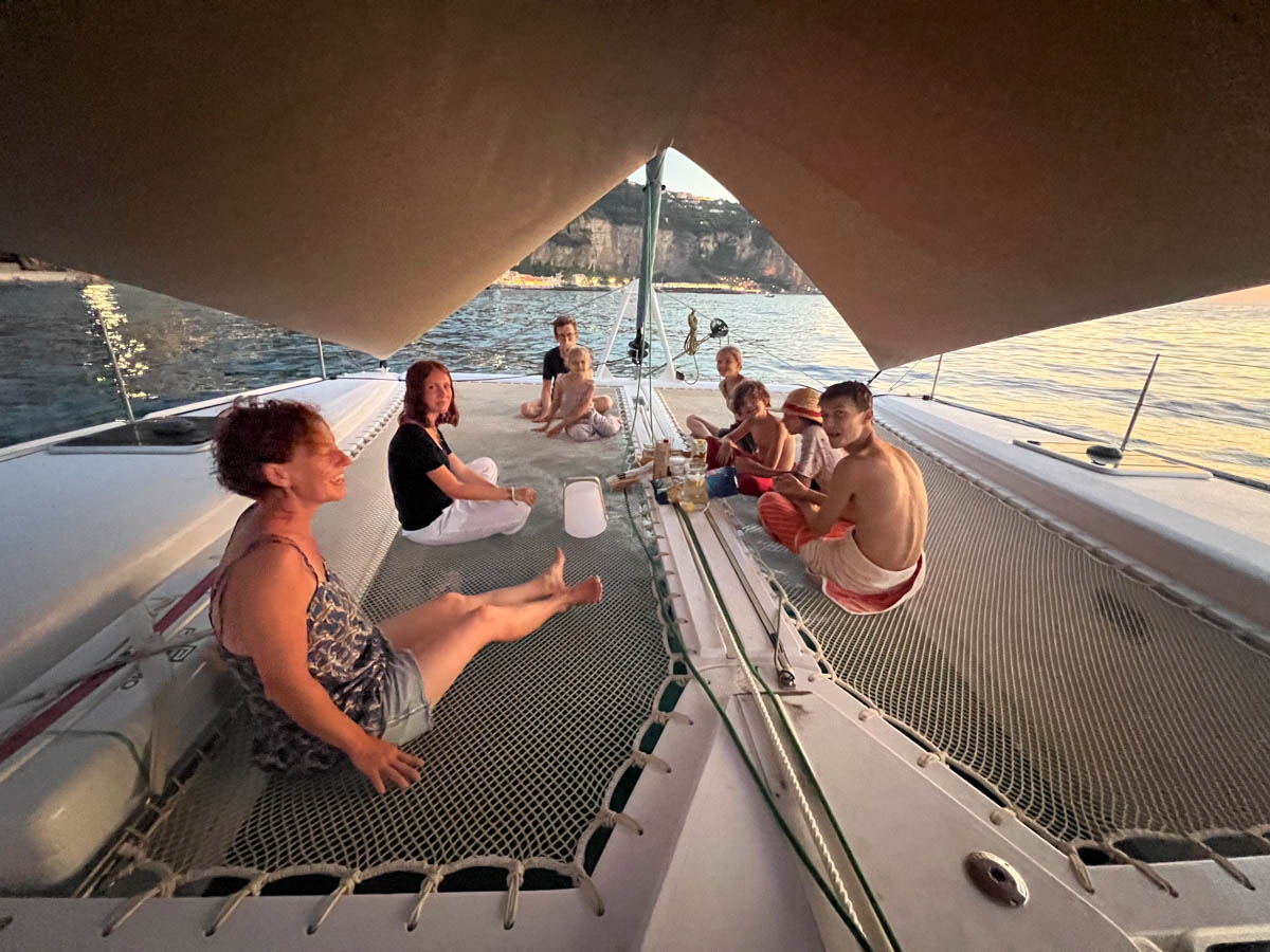 Après une traversée tranquille – mais appétissante – depuis les îles Eoliennes nous sommes mouillés devant la plage de Vico Equense au sud de Naples. Eliot, Louna et Cassandre sont arrivés eux aussi au camping à côté du port de Vico Equense. Nous avons prévu de les retrouver dès le soir et d’aller visiter Pompéi le lendemain.