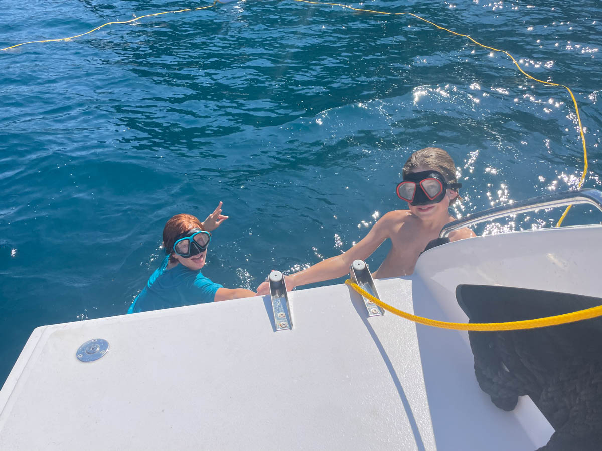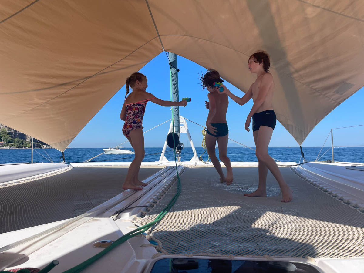 Le soir on invite tout le monde à découvrir le bateau, prendre l’apéro sous la canopée au soleil couchant et dîner à bord. Après une soirée film, Eliot reste dormir à bord pendant que Louna et Cassandre retournent au camping à côté le port.