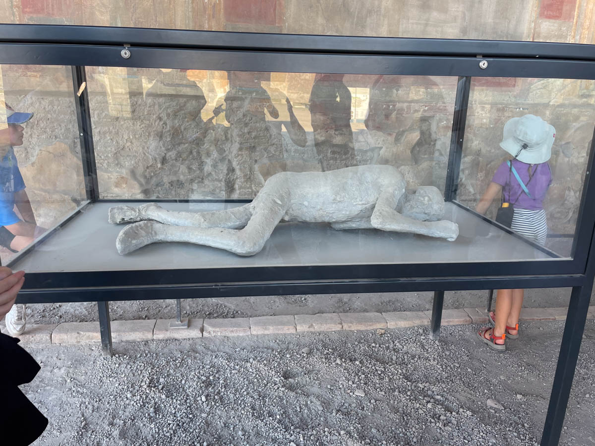 Nous arrivons ensuite sur le forum qui est bordé de temples, de marchés et de la blanchisserie. Nous découvrons les corps « pétrifiés » de 3 personnes. En fait il n’y a pas de corps pétrifiés car ils se sont décomposés depuis longtemps mais l’espace qu’ils occupaient dans la cendre est resté vide; un archéologue a eu l’idée de sonder le sol à la recherche de cavités et d’y injecter du plâtre liquide. Ainsi il a obtenu des moulages des corps avec la précision des étoffes et des chaussures. L’éruption a duré 3 jours : d’abord des cendres fines (la majorité des habitants sont partis, seuls quelques esclaves sont restés pour surveiller les maison des pillages), puis il y a eu des nuées ardentes (qui ont tué les 2000 derniers habitants) et ensuite des cendres volcaniques qui a tout recouvert.