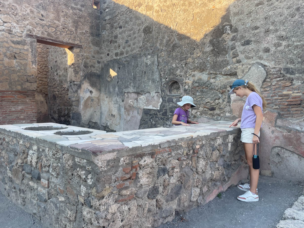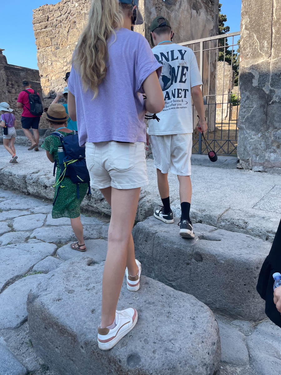 Nous arpentons les rues de la ville qui sont bordées d’échoppes. Nous voyons l’ancêtre du fast-food avec son bar qui servait des pains et boissons. Il semblerait que les serveuses étaient essentiellement des jolies femmes pour attirer le chaland… La chaussée est assez basse avec de hauts trottoirs afin de préserver les piétons et boutiques des eaux pluviales en cas d’averses. Nous sautons sur passages piéton composés de grosses pierres disposées selon une écartement standard qui étaient adaptées au dimensions des chars de Pompéi. Les étrangers devaient laisser leur char aux portes de la ville et louer un véhicule spécial… ils avaient tout compris au commerce.