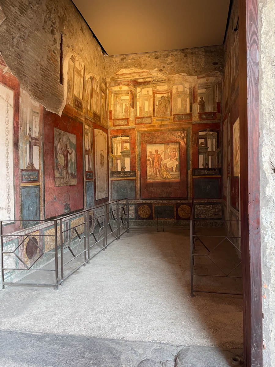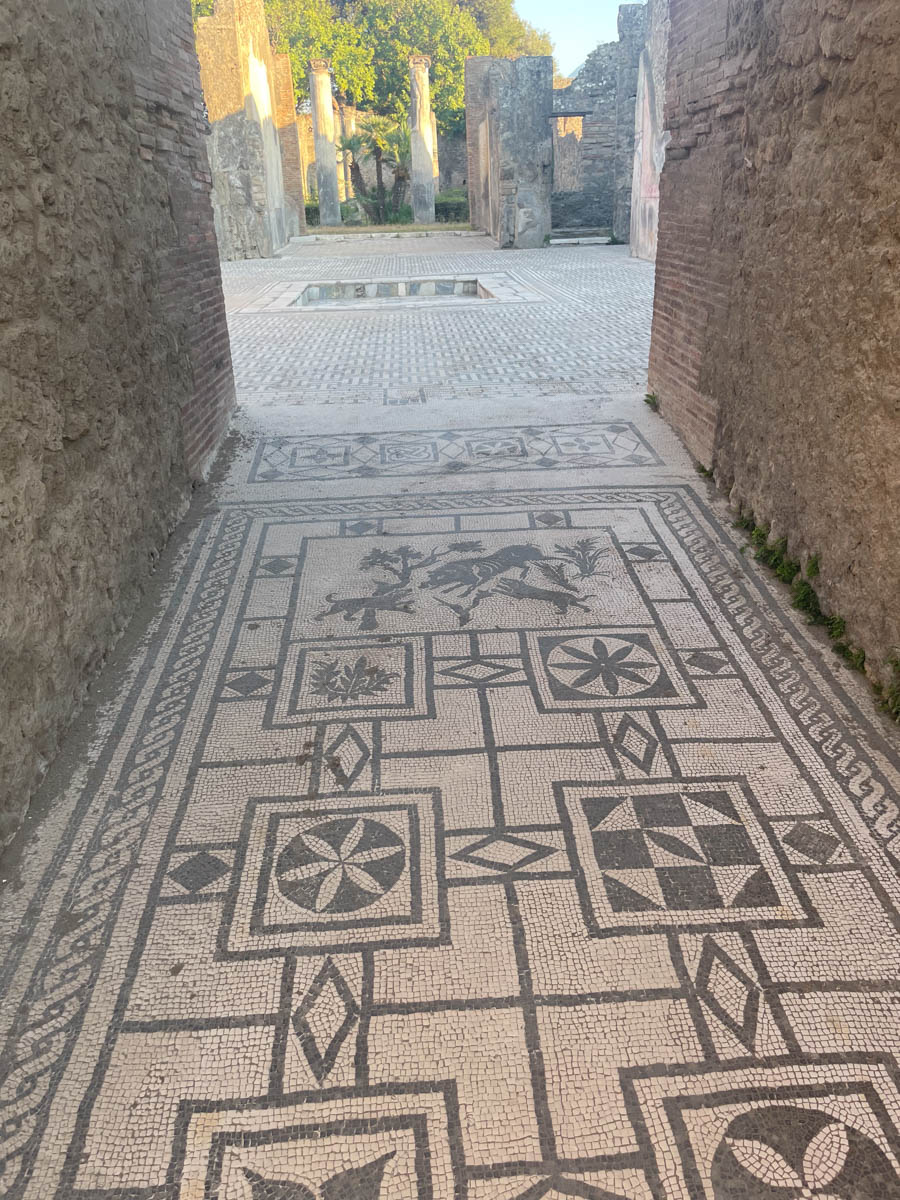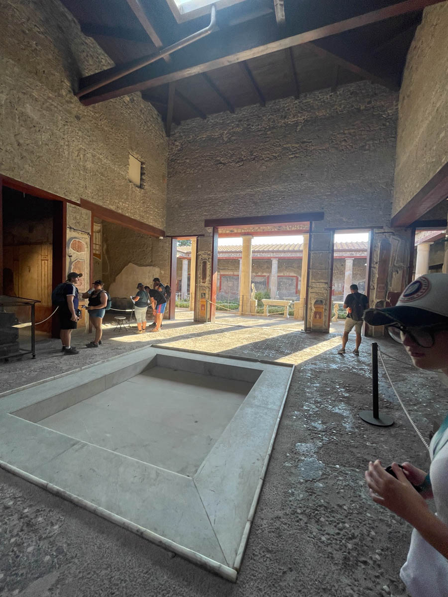 À la fin de la visite nous allons voir une Domus (maison d’un riche propriétaire) richement décorée de fresques aux couleurs rouge et jaune. Le plan est toujours le même : nous pénétrons dans l’atrium avec un bassin carré au milieu qui collecte les eaux de pluie des toits afin de remplir la citerne au-dessous. Le bureau du maître donne sur cet espace ainsi que des pièces de réception richement décorées. Ensuite nous entrons dans un genre de cloître avec un jardin en son centre, de part et d’autre les pièces de vie de la famille et plus loin les cuisines et pièces pour les esclaves qui ne sont pas décorées.