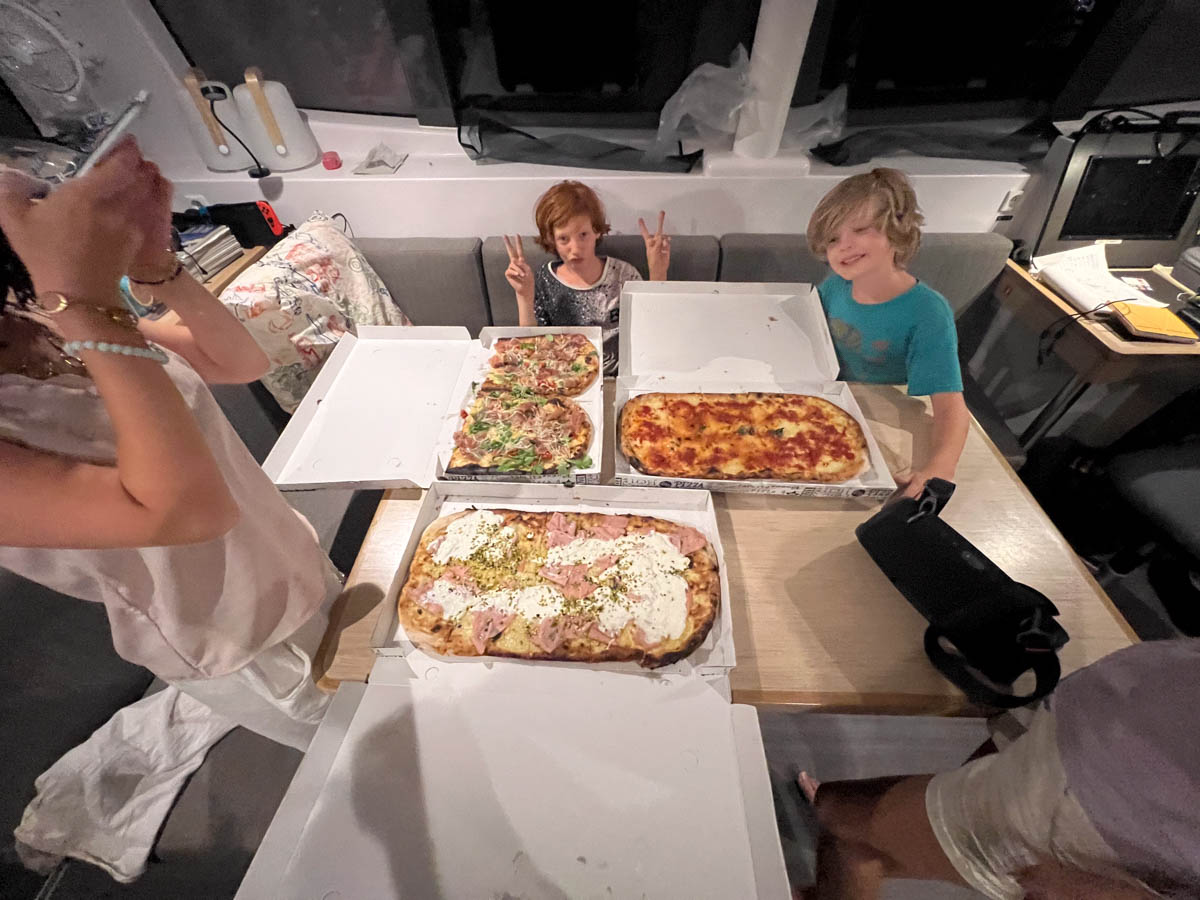 Nous retrouvons Antoine sur le port et on se met à la recherche d’un restaurant. Mais pour 9 sans réservation c’est un peu compliqué. Alors on va commander la spécialité du village : des pizzas napolitaines au mètre ! Nous prenons 3 demi mètres que nous allons manger sur le bateau. C’est très bon après toutes ces émotions et cette marche.