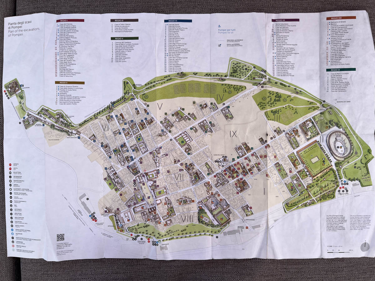 À 16h nous retrouvons notre guide Nello qui nous équipe d’oreillettes pour bien l’entendre. Nous rentrons par le port de Pompéi. En effet la ville fondée par les grecs puis investi par les romains était au bord de la mer mais l’éruption qui a duré 3 jours et recouvert la ville de plus de 12 mètres de matière volcanique a fait avancer le trait de côte 2 km plus loin. Nous grimpons des vestiges du port vers la ville par une rue pavée en pierre volcanique. La cendre a tout recouvert de l’automne 79 à l’an 1748 quand un paysan creusant un puit remonte des statues romaines ce qui déclenche les fouilles. Le poids de la lave avait écroulé la plupart des constructions, les archéologues ont non seulement déblayé la cendre mais aussi reconstruit les murs.