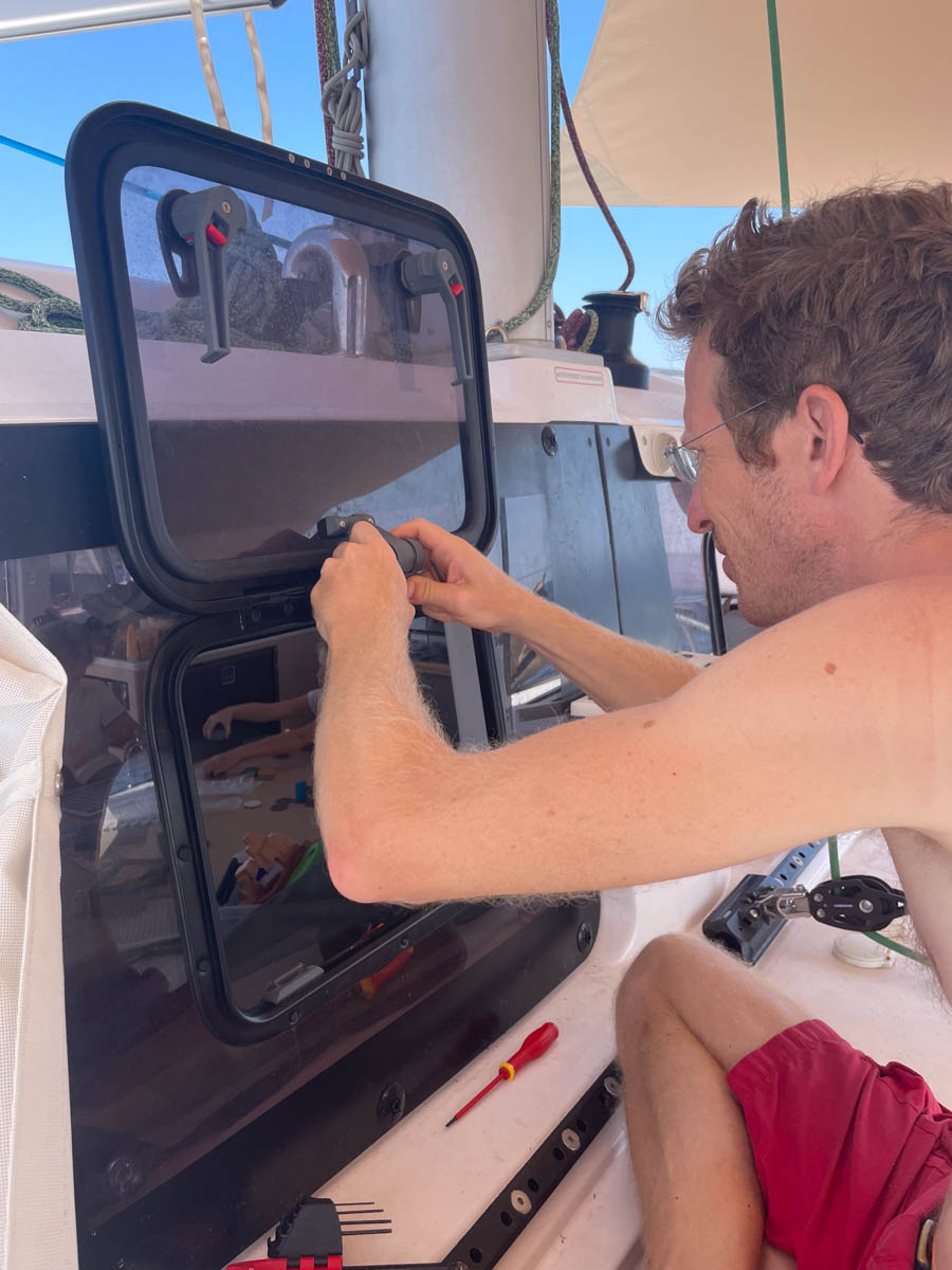Le réveil est tranquille : nous faisons un jeu de société et Antoine essaye de remonter le hublot avant … ça semble tenir ! Youpi ! Néanmoins, il ne remonte pas le frein qui ajoute de la contrainte sur les charnières. Le hublot servira ouvert ou fermé, nous testerons le frein une fois de retour à La Grande Motte pour pouvoir faire changer le hublot si nécessaire.