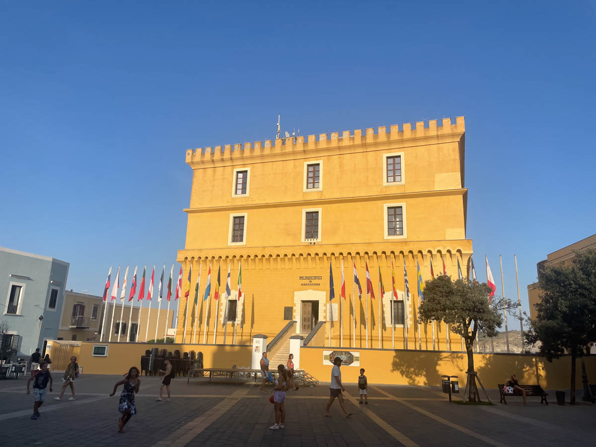 Ce n’est pas bien indiqué, même sur le plan du téléphone, alors on se retrouve dans des petits chemins qui débouchent dans des jardins particuliers. Nous traversons très vite et finissons par arriver à la pointe où se trouve les vestiges de la villa (tout est fermé) et le cimetière des prisonniers. Nous retournons vers le village par les rues normales. Nous admirons la place centrale occupée par la mairie-château qui arbore tous les drapeaux de l’Europe en souvenir de Ernesto Rossi. Nous trouvons un petit supermarché qui nous permet de compléter le frigo en produits frais. Et en redescendant nous sommes intrigués par une boutique de souvenirs qui vend des canards en bois peints de costume divers. La vendeuse nous explique que ce sont les porte bonheurs de Ventotene car à l’époque de Giulia il y avait beaucoup de canards sur l’île qui criaient dès qu’un navire approchait. Les marins étaient ainsi prévenu de l’éventuel danger. Nous trouvons le symbole sympathique et nous cherchons un canard pour notre bateau. Nous en dénichons un qui plaît à tout le monde avec son polo marin bleu et blanc et sa casquette de capitaine. Nous lui cherchons un nom : ce sera Roberto James Ventotene.