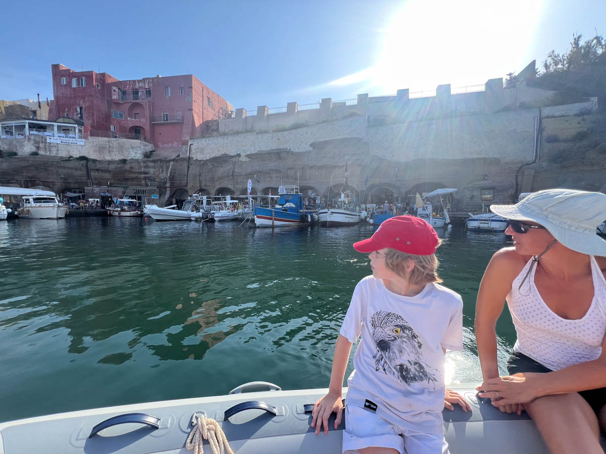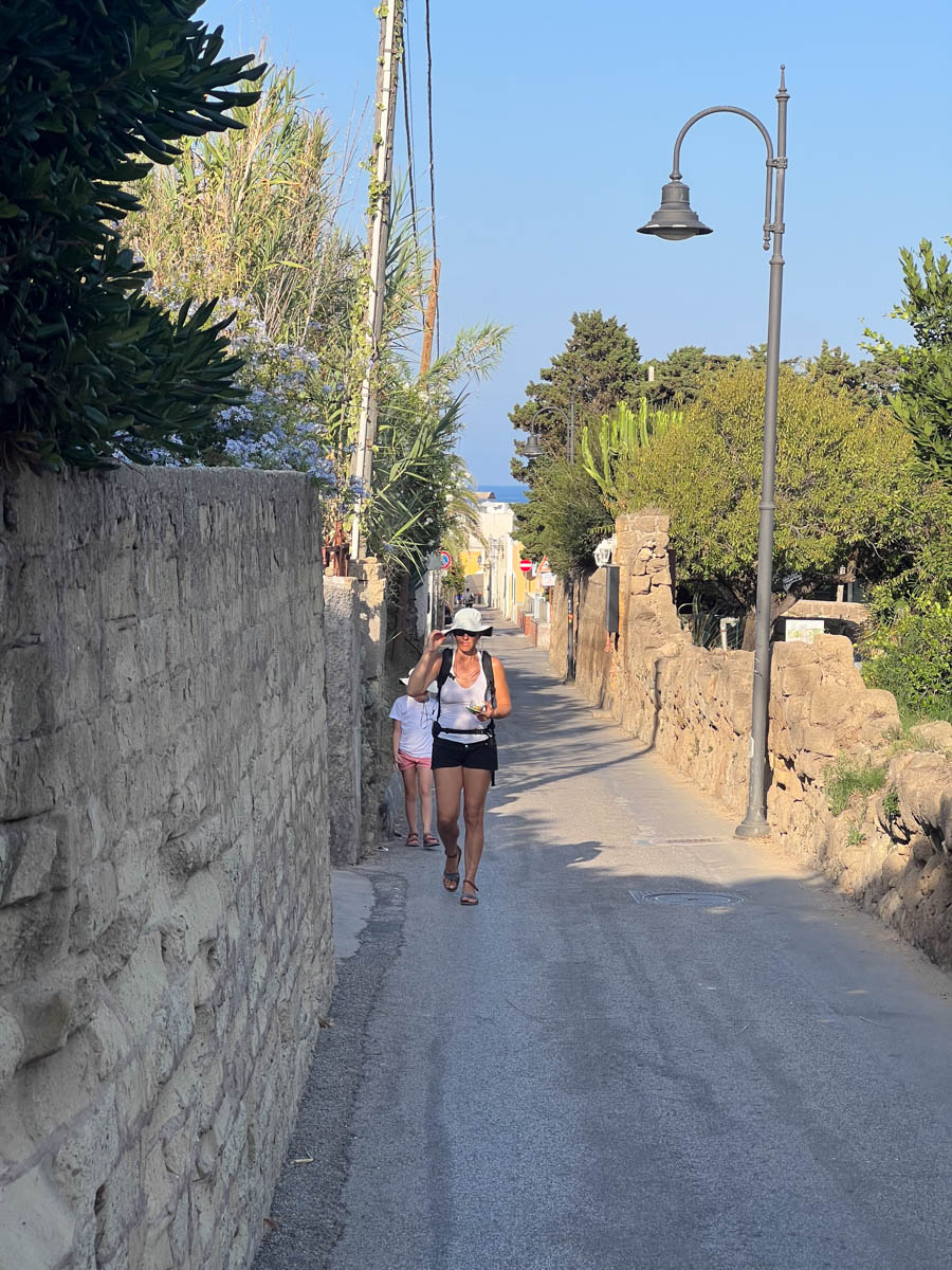 Après déjeuner les parents vont voir en annexe si le mouillage près du port est mieux (plus abrité et/ou plus tranquille) mais ça ne semble pas le cas. On restera à notre place ce soir. Ensuite nous débarquons tous ensemble pour découvrir l’île à pied. Nous arrivons dans le port romain en annexe et pouvons encore voir les bites d’amarrage creusées dans la roche et les abris pour les galères qui sont comme des sortes de garage. Les quais sont les mêmes qu’à l’époque. C’est un des ports romains les mieux conservés. Nous laissons l’annexe au marinero Enrico qui le déplacera selon ses besoins pour qu’elle ne le gêne pas (oui, il faut avoir confiance en cet homme que nous venons de rencontrer) et partons à la recherche d’une glace. Rien sur le petit port alors nous montons les ruelles de l’unique village jusqu’à une petite gelateria cachée dans un hôtel, avec peu de choix mais délicieuse. Ça nous donne des forces pour continuer à marcher jusqu’à la villa Giulia.