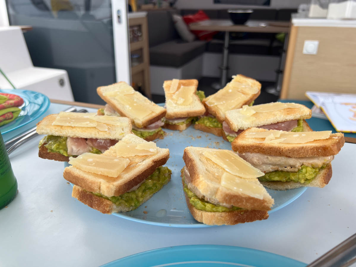 Pour le déjeuner Arthur et Alice ont imaginé une recette au thon : une tranche de pain de mie grillé recouverte de guacamole surmontée d’un pavé de thon juste cuit à l’unilatéral et le tout recouvert d’une tranche de pain de mie grillée parsemée de copeaux de parmesan. C’est excellent ! Ils prénomment leur création le « Roberthon » (en l’honneur de Roberto le canard de Ventotene)