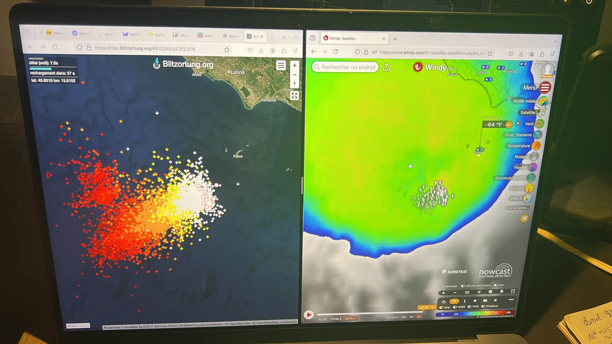 Dans la soirée Antoine découvre les orages violents survenus aux Baléares et en profite pour regarder les prévisions pour notre zone. Et là nous voyons arriver un gros orage au à l’Ouest de l’île. Nous rallongeons la chaîne pour être sûrs de tenir si le vent monte et nous mettons des pare-battages tout autour du bateau au cas où un bateau voisin dérape sur nous. Nous suivons en temps réel l’avancée des impacts de foudre par satellite sur le site Blitzortung et sur la carte radar / satellite de Windy. Et nous voyons aussi des éclairs zébrer le ciel au dessus de l’île comme un feu d’artifice. À 23h tout s’arrête d’un coup. L’orage s’est arrêté juste avant nous. On peut aller se coucher sereinement.