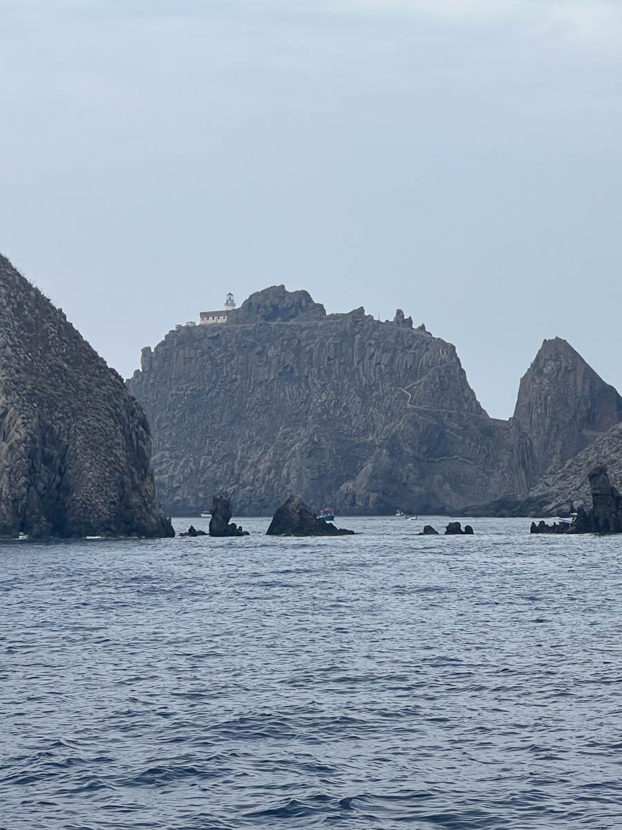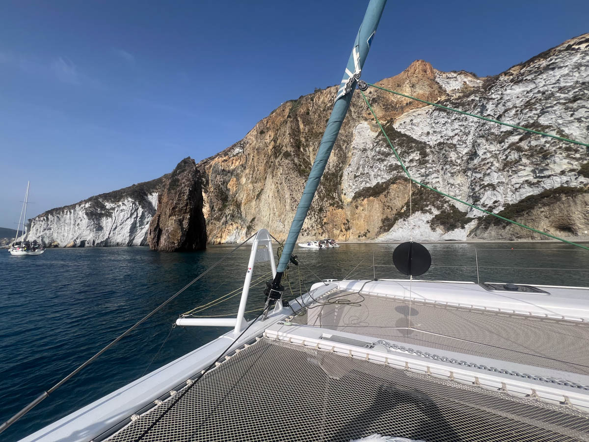 Le lendemain, vendredi 16 août à 10h nous partons vers l’île de Ponza. Le vent est tranquille, nous déroulons encore le code zéro alors que le vent de Nord ne dépasse pas 5nds. C’est la magie de la combinaison Outremer 45 et Code Zéro. Nous pouvons avancer à 60-70% de la vitesse du vent réel à 60° du vent et donc progresser dans les plus petits airs.