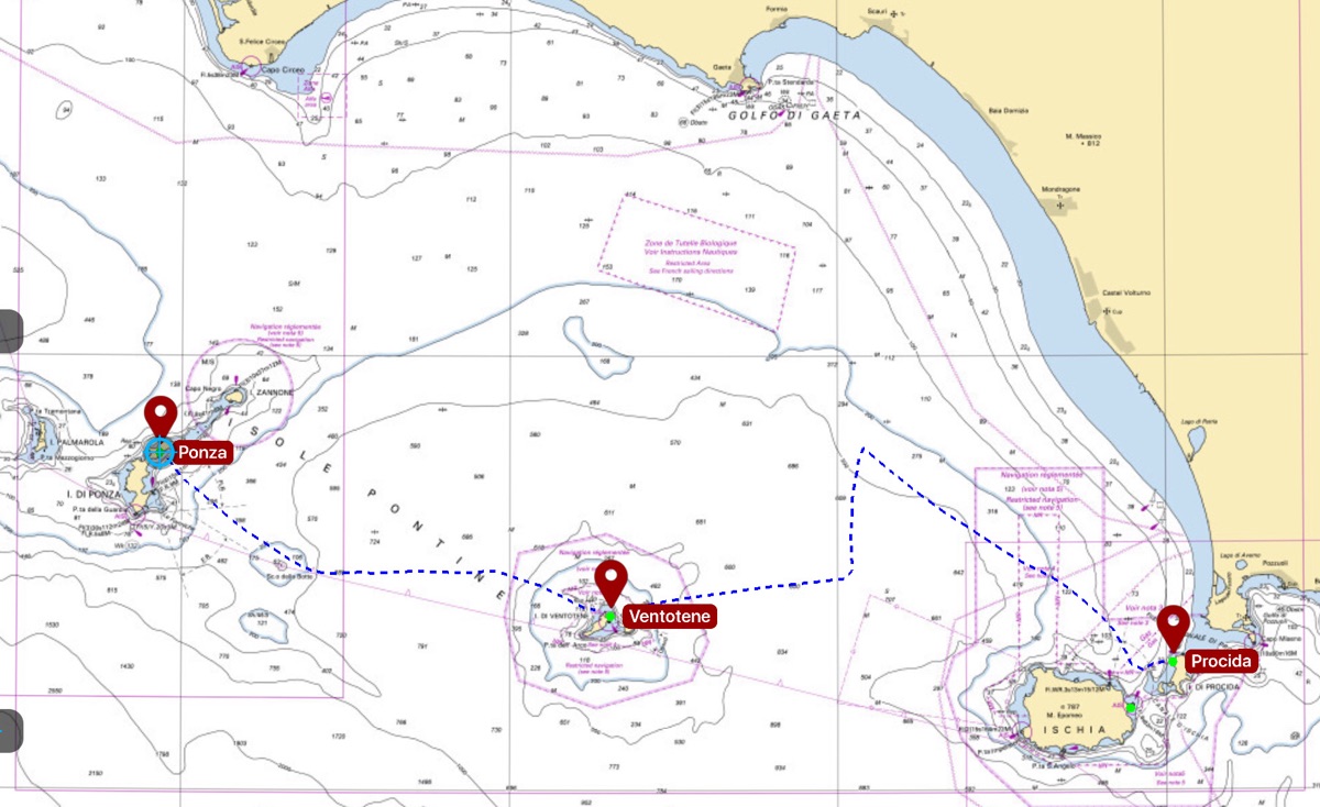 Ce mercredi 14 août Eliot, Louna et Cassandre sont repartis en ferry vers Naples depuis Procida. Ils sont ensuite retournés en train à leur camping et ils ont retrouvé leur voiture avec laquelle ils entament eux aussi le chemin du retour. Après le goûter dans la petite crique au Nord de Procida, agréementé de glaces achetées à un bateau-glacier itinérant, nous mettons les voiles vers les îles Pontines de Ventotene et Ponza.