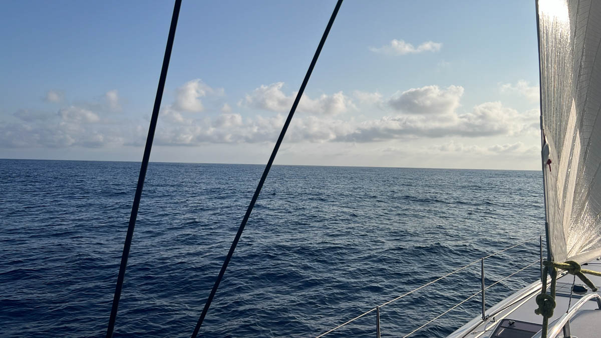La nuit se passe à surveiller le vent et avancer au moteur de haut en bas sur la houle. Au petit matin, on se demande quand le vent va arriver. Comme il doit être fort un peu plus au nord, avec des vagues, nous restons une vingtaine de milles plus au sud, là où il devrait rester entre 10 et 15 noeuds… Les prévisions sont tellement décalées qu’Antoine essaye de deviner d’où le vent va revenir en observant les nuages, sans grand succès. Vers 8h30, un poisson mord à la ligne qu’Antoine a remis à l’eau au petit jour. Il essaye de le remonter (sans avoir ralenti le bateau…) mais bientôt ça tire encore plus fort et puis plus rien. À la fin de la remontée, Antoine constate que le poisson a emmené tout le bas de ligne, c’est la ligne qui a cassé. Comme il ne se rappelle plus comment faire le nœud pour attacher l’émerillon au bas de la ligne et qu’il n’y a plus de connexion à Internet pour le lui rappeler, la canne est rangée.