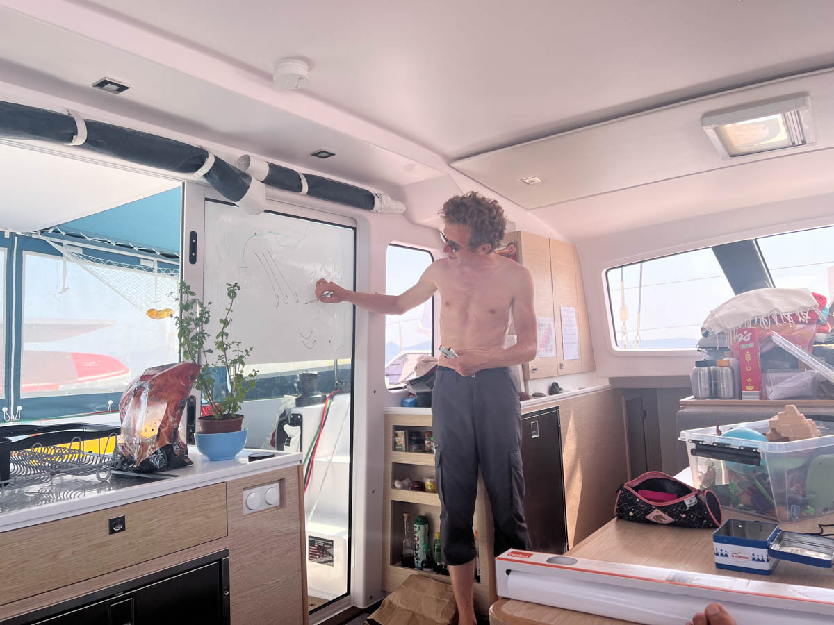 Nous prenons un bon déjeuner à base de poulet rôti et chips et une dose de médicament presque pour tout le monde, en prévision de la houle. Antoine organise un briefing pour l’équipage sur tableau blanc, il est beaucoup plus animé que devant la tablette habituelle. C’est la première fois que nous utilisons les feuilles électrostatiques qui se révèlent très pratiques !
