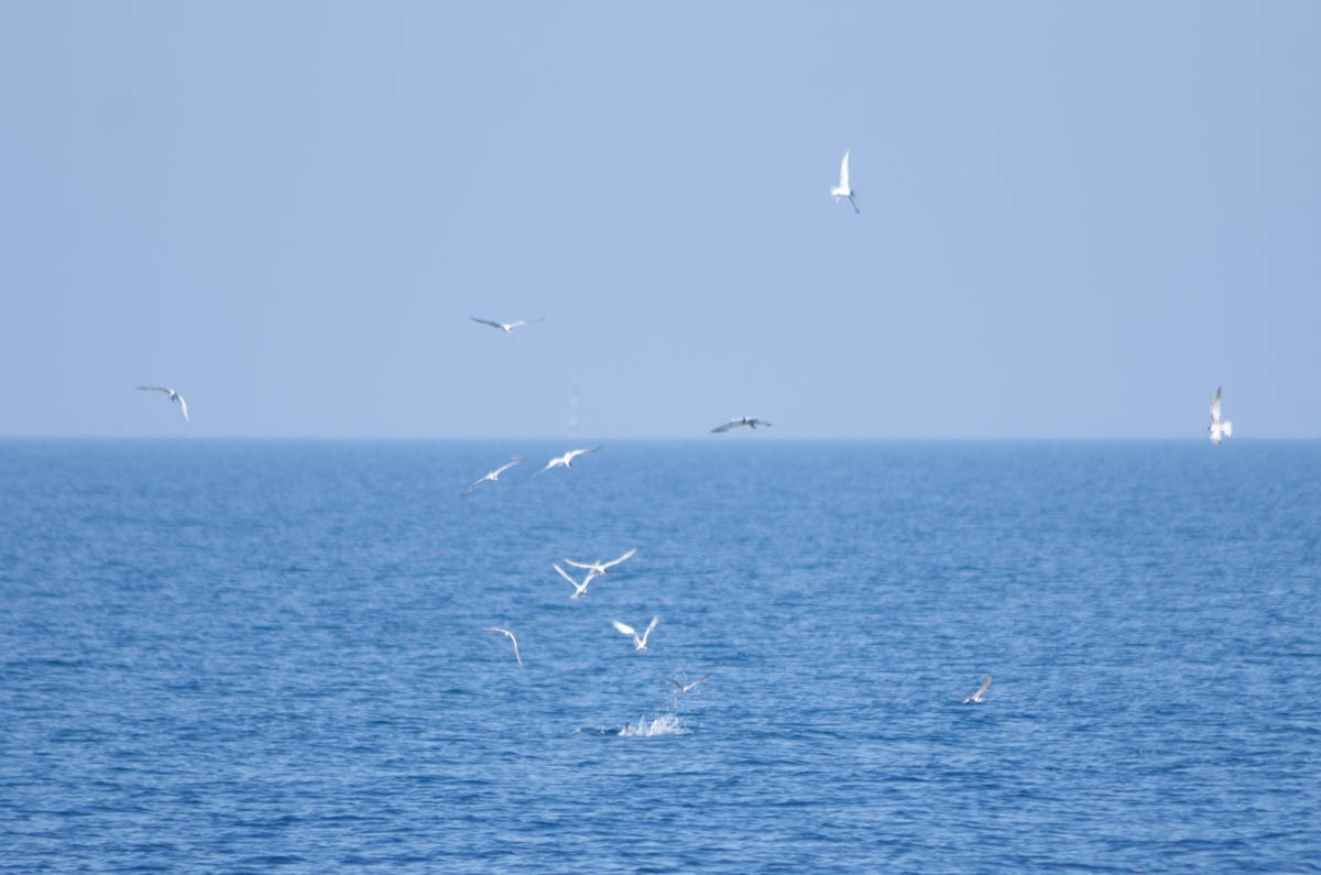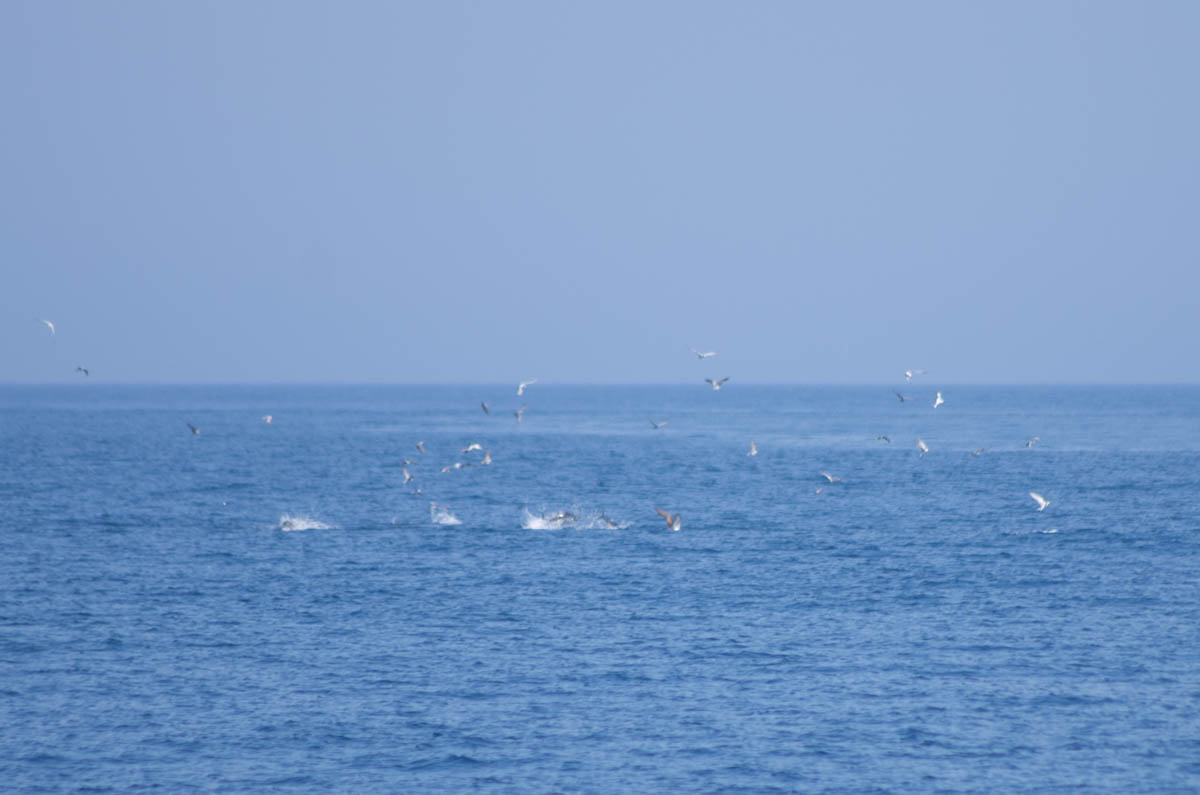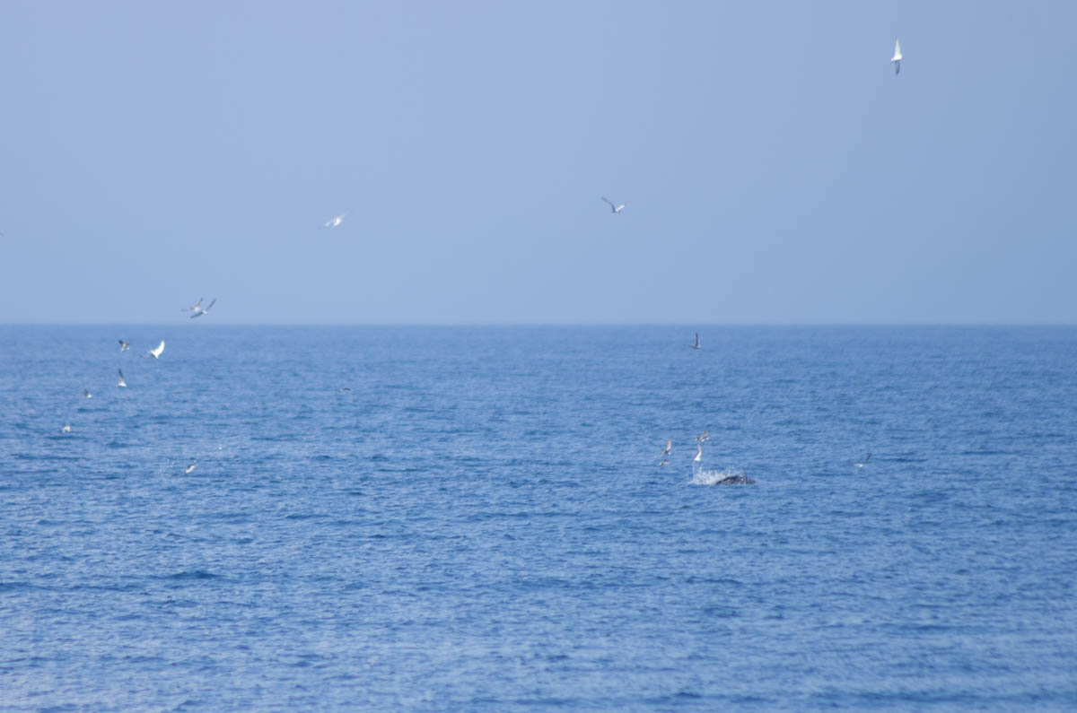 Vers 5h30, le vent revient à nouveau et Antoine peut à nouveau dérouler le Gennaker mais seulement pour 2h car le vent refuse (tourné vers l’avant) et Antoine change la voile d’avant pour le code zéro, notre voile de petit temps habituelle en Méditerranée. Nous tirons des bords ainsi toute la journée. À l’intérieur, les jeux de société s’enchaînent. À l’extérieur, alors que nous passons au large du parc éolien de Marseille, nous croisons de nombreux bateaux de pêche de loisir et nous comprenons bientôt pourquoi, la surface de l’eau qui est à peine ridée par les vaguelettes du vent se couvre d’écume et nous voyons des animaux aquatiques sauter hors de l’eau, accompagnés de goélands au-dessus de la zone. Nous identifions à l’aide des jumelles des bancs de thon qui chassent !