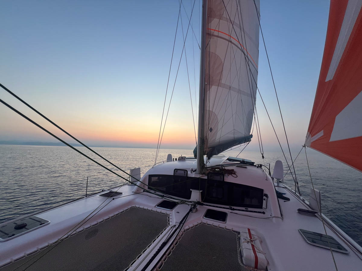 Alors que nous approchons de l’entrée de la baie de La Grande Motte, longeant la plage de l’Espiguette, nous apercevons à l’AIS un autre Outremer que nous connaissons déjà, El Nido. Nous l’appelons à la VHF et découvrons qu’il s’agit d’un stage d’entraînement avec un skipper Outremer. Ils nous doublent avec leur Gennaker, Antoine essaye de résister à l’envie de remettre à nouveau le gennaker pour rivaliser mais il finit par craquer, et nous remettons à nouveau le gennaker, quelques minutes avant que la nuit ne tombe.
