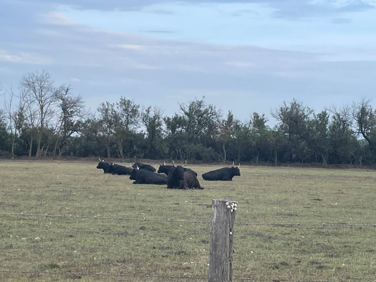 Nous continuons avec la visite d’une manade de chevaux camarguais. Enfin nous allons déguster les spécialités locales (fougasses salées et sucrées, saucisson de taureau et vins locaux) devant un champ où paissent les plus beaux taureaux noirs. Entre chaque étape, nous écoutons les chansons françaises des années 50-60 hymne de la région (Jean Ferrat, Johnny, Brassens, Piaf). Phil est tellement passionné que nous finissons la visite à 22h, 2h après l’horaire prévue. Nous allons directement au lit sans dîner.