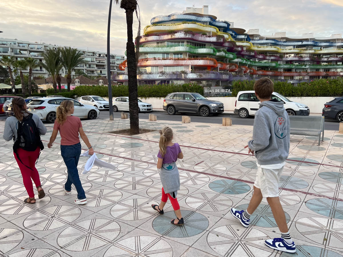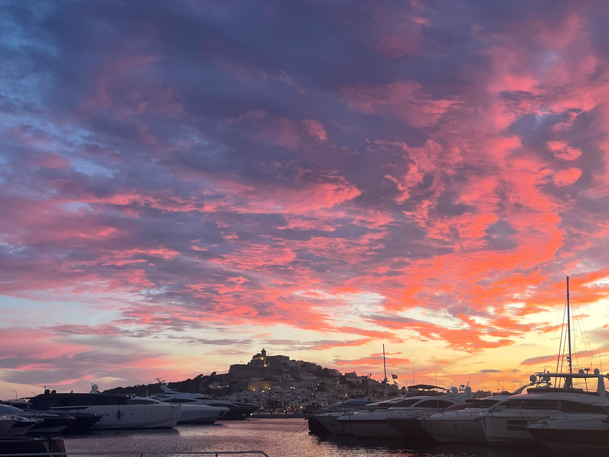 Nous mettons très vite l’annexe a l’eau pour nous promener le long des avenues devant le port et chercher un restaurant. À Talamanca il y a un tout petit quai où nous pouvons laisser l’annexe gratuitement et débarquer facilement, c’est top. Nous flânons sur la large avenue bordées de jardins et d’aires de jeux pour adultes et enfants. Le soleil se couche et illumine les nuages d’un rose profond : c’est magnifique ! Par contre impossible de trouver un restaurant familial ouvert, c’est la fin de saison et beaucoup sont fermés, seuls les établissements de luxe sont là. Un peu dépités, nous rentrons au bateau pour faire réchauffer une boîte de couscous express.