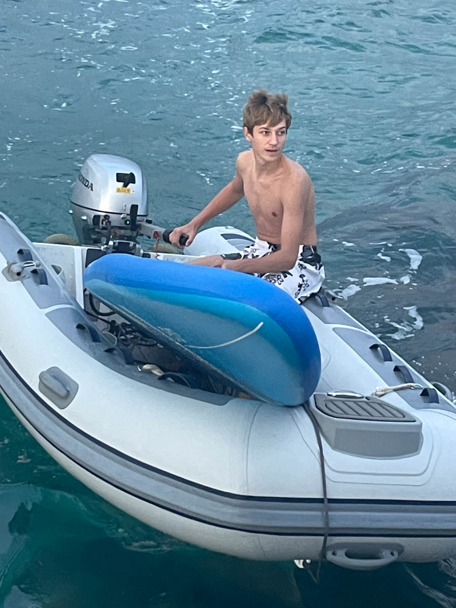 Vers 19h on se prépare aller à terre pour retrouver l’équipage d’Apsara et leurs bateaux-copains quand on s’aperçoit que notre annexe n’est plus attachée au bateau ! Elle a dérivé vers la côte. Arthur saute sur le paddle pour aller la rattraper pendant qu’Antoine demande à Dennie d’Apsara de nous aider avec son annexe. Ils arrivent à ramener l’annexe qui s’était heureusement arrêté sur une ligne de bouée ! On a eu beaucoup de chance qu’elle ne s’écrase pas sur des rochers ou pire partie vers le large… depuis on fait très attention à son nœud d’attache.