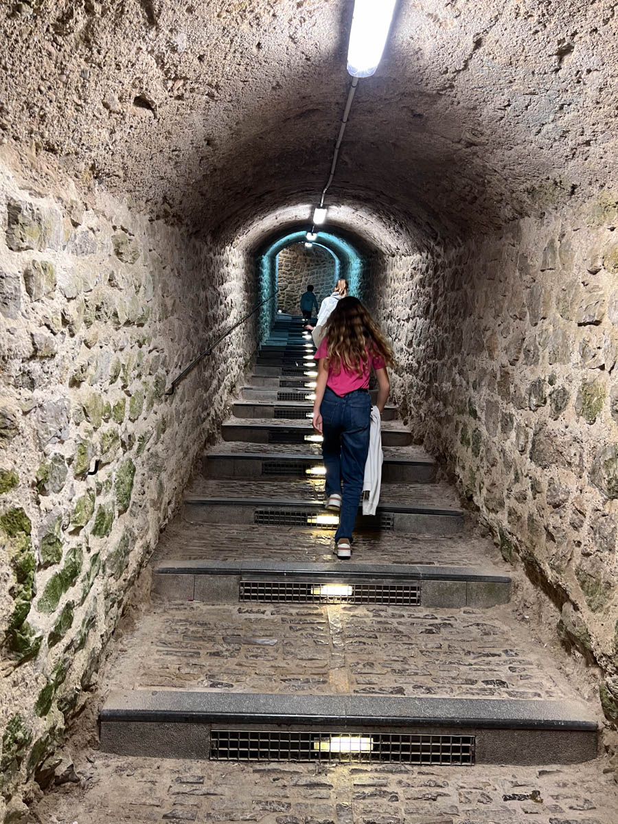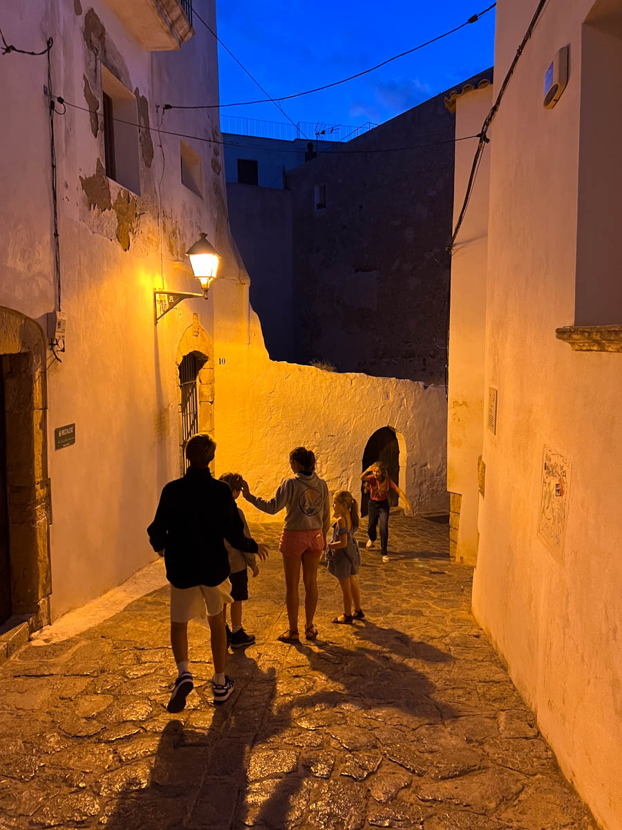 Mais à 17h on part enfin visiter la vieille ville d’Ibiza ou Eivissa (en catalan) avec le city boat, c’est un bateau bus qui traverse le port et nous mène directement au pied de la vieille ville (merci les conseils de Philippe). La première chose à faire en débarquant est de trouver un bonne glace pour le goûter. Ça nous donne des forces pour grimper jusqu’aux remparts, passer le pont levis et continuer à monter jusqu’au sommet. Nous admirons les bâtiments et le paysage. Nous passons même dans un passage secret pour finir les derniers mètres jusqu’en haut des fortifications. La ville est très belle et très bien conservée grâce au classement patrimoine mondial de l’UNESCO. Nous arrivons trop tard pour entrer dans l’église sommitale alors nous redescendons les ruelles pavées.