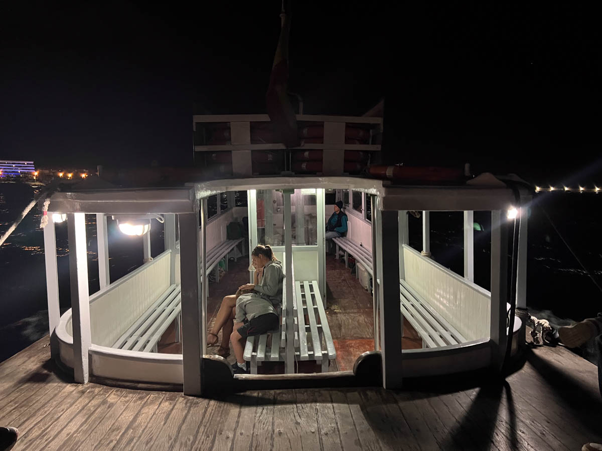 Quand le soleil se couche, il est temps de rentrer au bateau et de se dessabler, la douche est rapide à l’arrière du pont avec le petit vent frais.