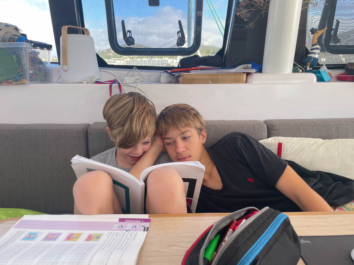 Vendredi 4 octobre on passe encore beaucoup de temps sur l’école. On ne va pas pouvoir tenir tout le voyage comme ça. On ne veut pas être bloqués toute la journée sur le bateau car on veut aussi pouvoir découvrir nos escales. Antoine et moi (Magali), on va reprendre tous les programmes des collégiens et lycéens pour voir comment alléger. On se rend compte que le CNED fait tout le programme de manière approfondie (ce qui est très bien mais un peu trop), à l’école les professeurs ne finissent jamais le programme; alors on va réduire les séances à 40 minutes au lieu d’une heure, refaire les emplois du temps et planifier tous les devoirs sur l’année. Ça nous prend plusieurs soirées mais on espère que cette nouvelle organisation nous conviendra mieux à tous.