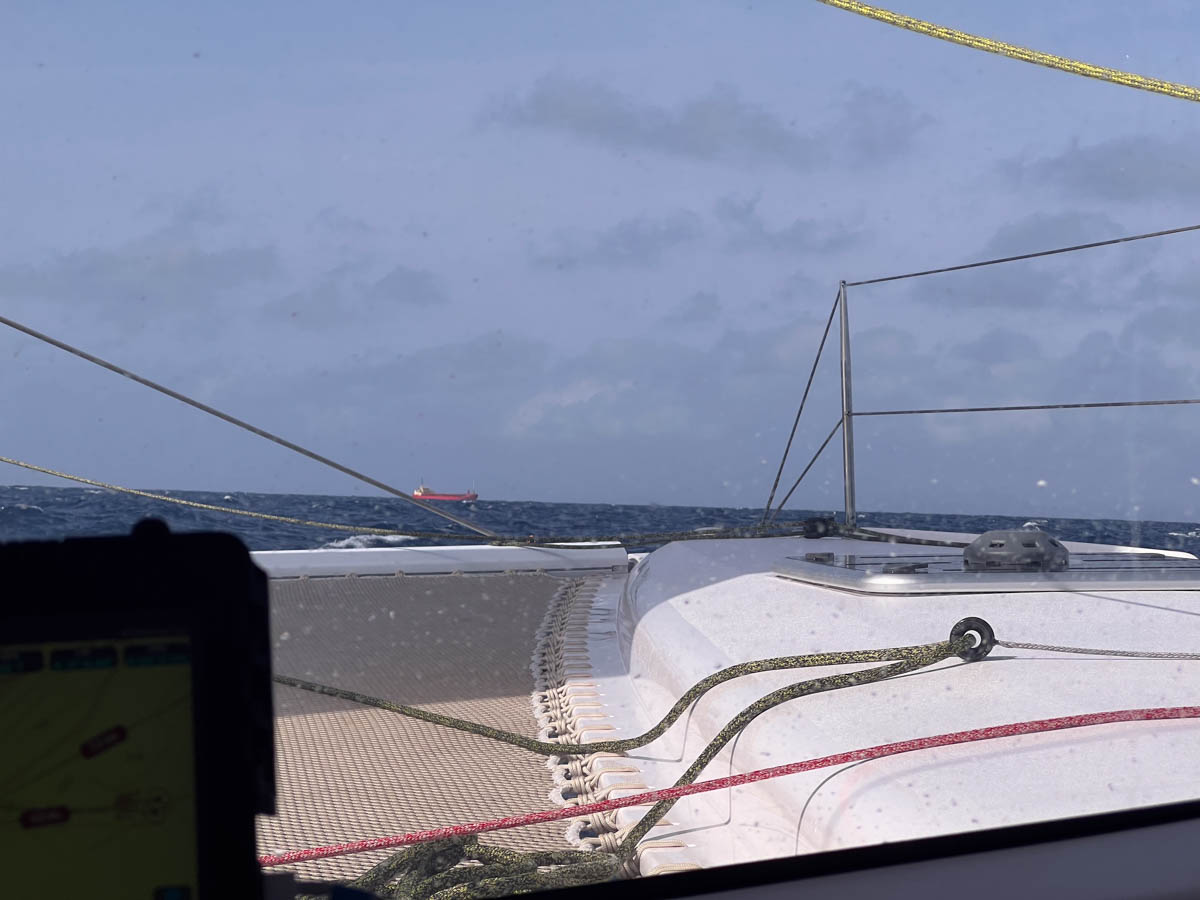 A l’approche du rail, nous décidons d’empanner avant de rentrer dans le trafic, et de rouler le gennaker pour calmer un peu le bateau et faire prendre du repos à nos organismes un peu fatigués par la nuit. Antoine part faire la sieste pendant 1h30 avant que nous n’empannions à nouveau en direction de Cartagena et traversions le rail des cargos en visant derrière eux. L’AIS est d’ailleurs une merveille pour nous aider dans cette entreprise, d’autant que Weather4D nous permet d’avoir un calcul en temps réel des positions les plus proches que nous aurons avec chaque bateau sans changement de trajectoire. Cela permet de viser les bateaux plus facilement et d’assurer les croisements.