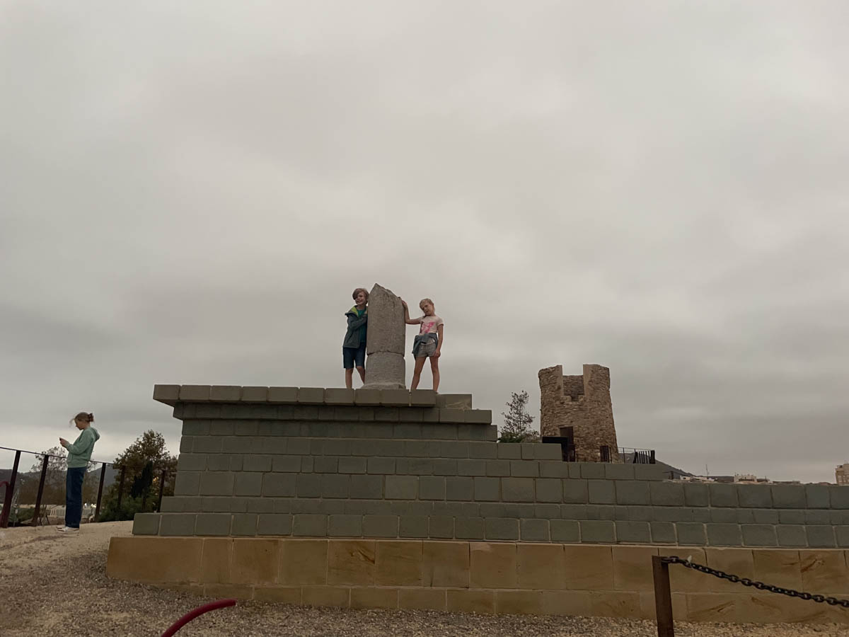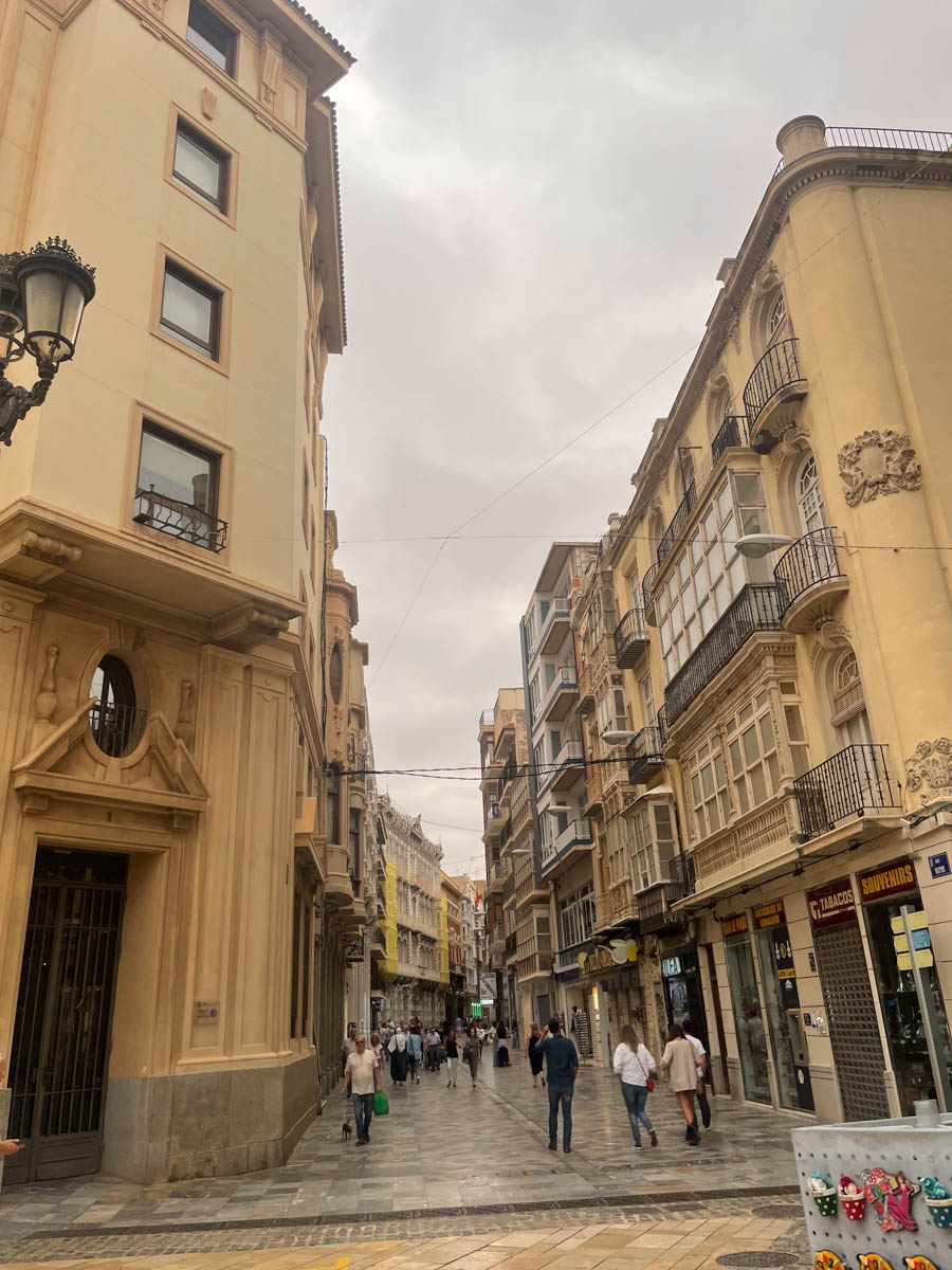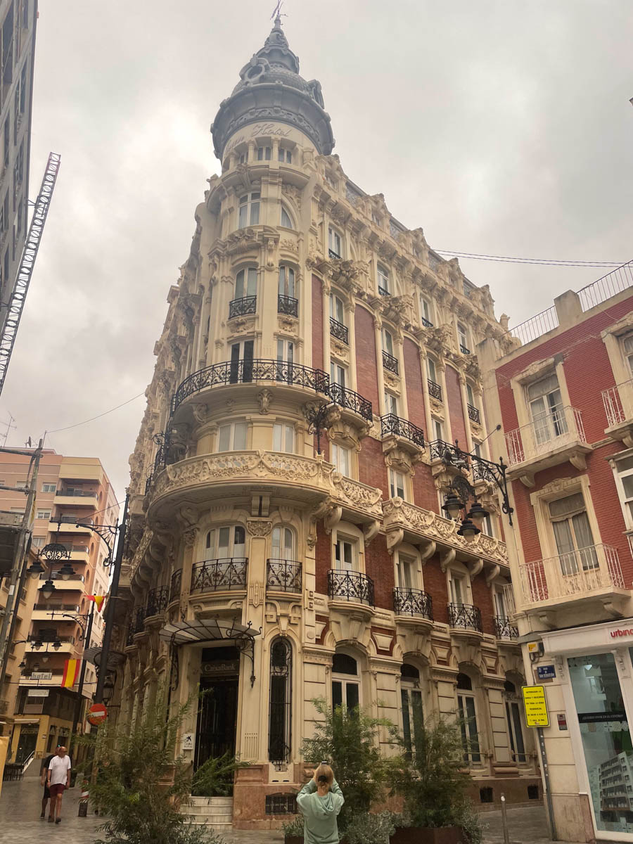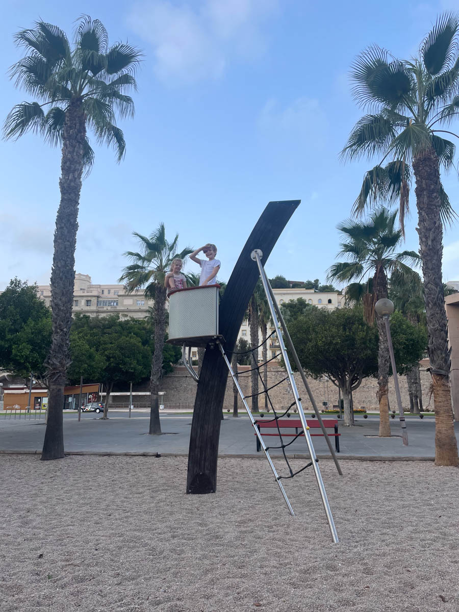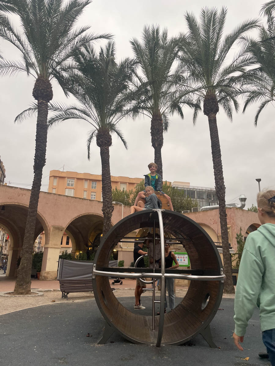 Nous sortons du port et prenons d’abord un escalier extraordinaire avec une fresque marine impressionnante. Nous débouchons sur de grande artères plantées de genre ficus aux troncs énormes. La ville est recouverte de drapeaux espagnols signes de la fête nationale il y a quelques jours, même les fleurs sont rouges et jaunes ! Nous avisons rapidement un café qui sert des churros à tremper dans du chocolat chaud : ça nous fait un très bon goûter. Avec cette énergie retrouvée nous déambulons dans les petites rues piétonnes aux immeubles ornés de belles façades mais dans un mélange de styles hétéroclites. Beaucoup de bâtiments sont en travaux un peu partout. Nous finissons notre balade sur une grande place avec des aires de jeux variées.