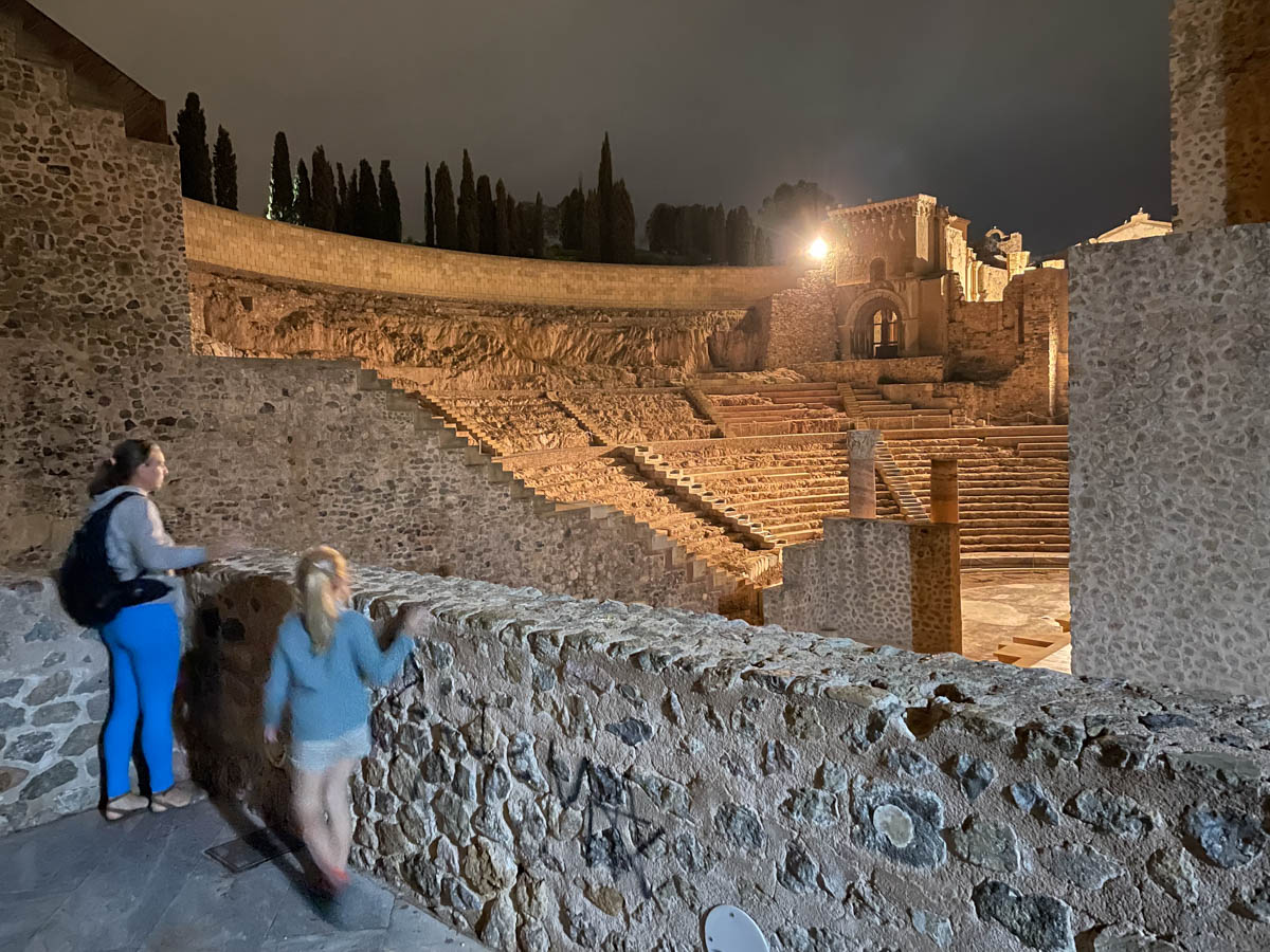 Nous nous apercevons que tous les musées et sites archéologiques sont fermés dimanche après-midi et lundi, on n’est pas arrivé au bon moment pour visiter. Alors on va rechercher des parcs ouverts autour des sites romains. Tout d’abord nous apercevons les fouilles du forum romain et d’un temple. Et ensuite nous voyons le superbe théâtre romain à travers les petites rues adjacentes. Même de nuit il est impressionnant, il a été découvert assez récemment (en 1988) et très bien restauré. On voit qu’ils ont du détruire les immeubles environnants pour dégager les vestiges.