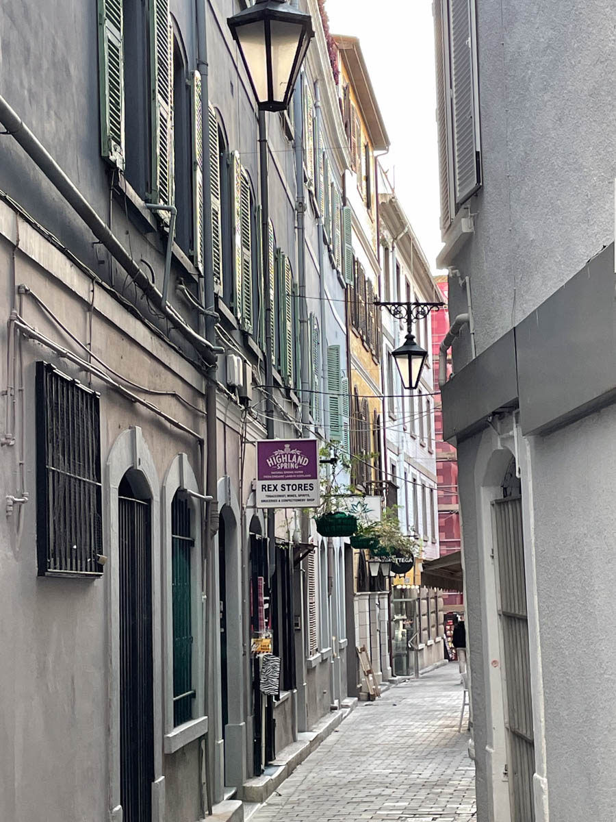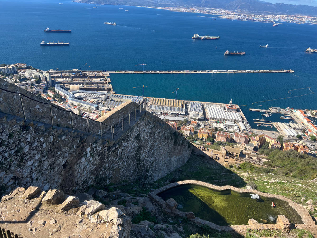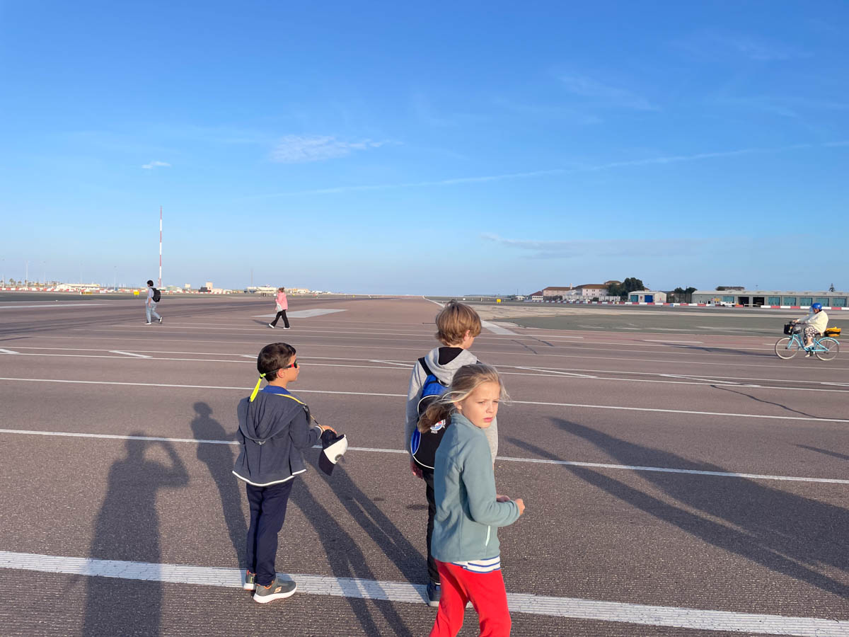 En fin d’après-midi nous partons à pied découvrir Gibraltar avec l’équipage d’Ilo et d’Apsara. Il faut d’abord marcher 2 kilomètres jusqu’à la frontière puis passer la douane espagnole puis anglaise, c’est un simple contrôle de nos passeports (nous n’avons même pas eu de tampon 😟) . Ensuite il faut traverser la piste de l’aéroport à pied. En effet l’aéroport est coincé entre le rocher et la frontière où c’est le seul endroit assez plat sur ce territoire de 6,8 km carré. C’est la première fois que nous marchons sur un tarmac pour visiter une ville. Enfin pour atteindre la vieille ville il faut d’abord déambuler à travers les grands immeubles serrés les uns à côté des autres il faut dire que c’est le 5ème territoire les plus densément peuplé au monde !