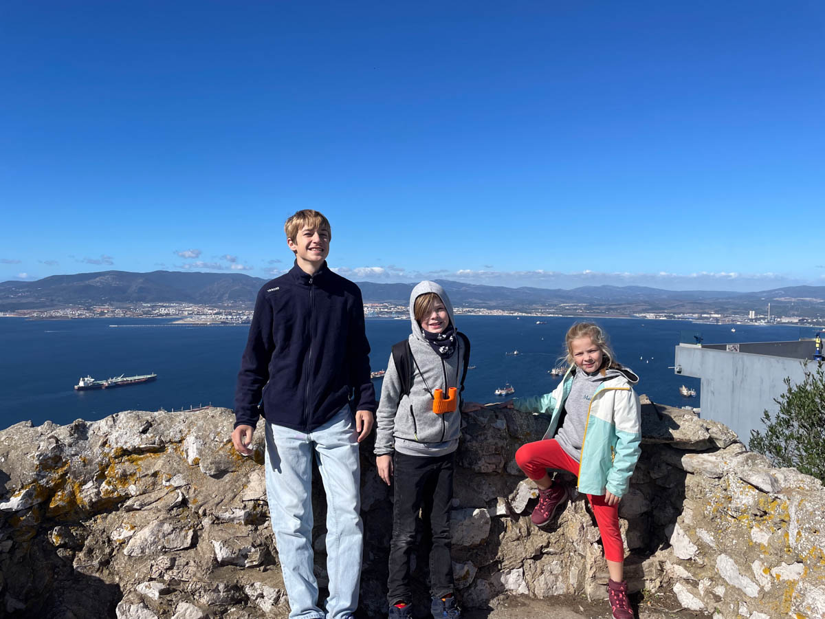 Samedi 26 octobre, c’est sortie culturelle au parc naturel du Rocher de Gibraltar. Départ 10h du ponton avec Ilo, les températures sont fraîches, nous sortons les pulls et les cirés, Ilo a même mis les bonnets ! Nous passons à nouveau la frontière et prenons le bus jusqu’au Cable Car (le téléphérique pour monter tout en haut). Nous avons voulu épargner au maximum les kilomètres inutiles aux enfants car nous allons beaucoup marcher aujourd’hui, plus de 8km en montée et en descente.